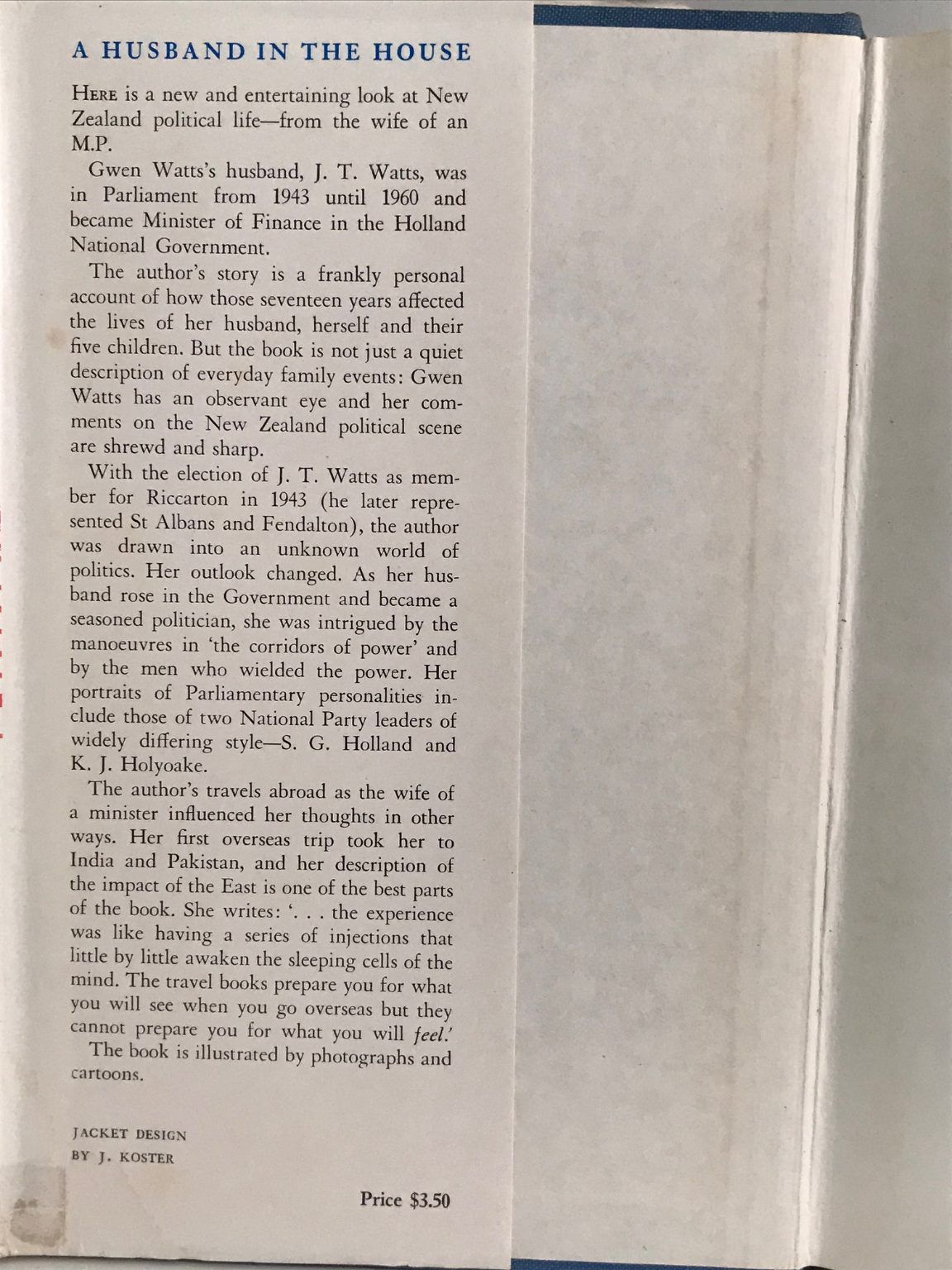 The author's husband, J. T. Watts, was in Parliament from 1943 until 1960 and became Minister of Finance in the Holland National Government. The author's story is a frankly personal account of how those seventeen years affected the lives of her husband, herself and their five children.