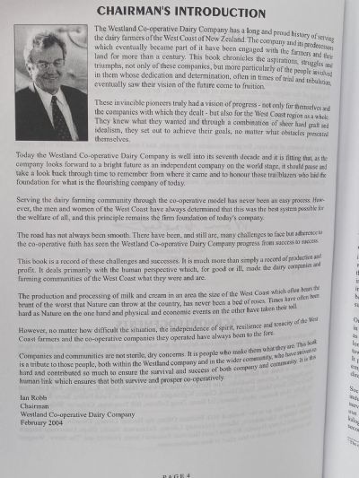 Celebrates the farming people of the West Coast of New Zealand and the dairy companies which they established and operated and which eventually united to form the Westland Co-operative Dairy Company.