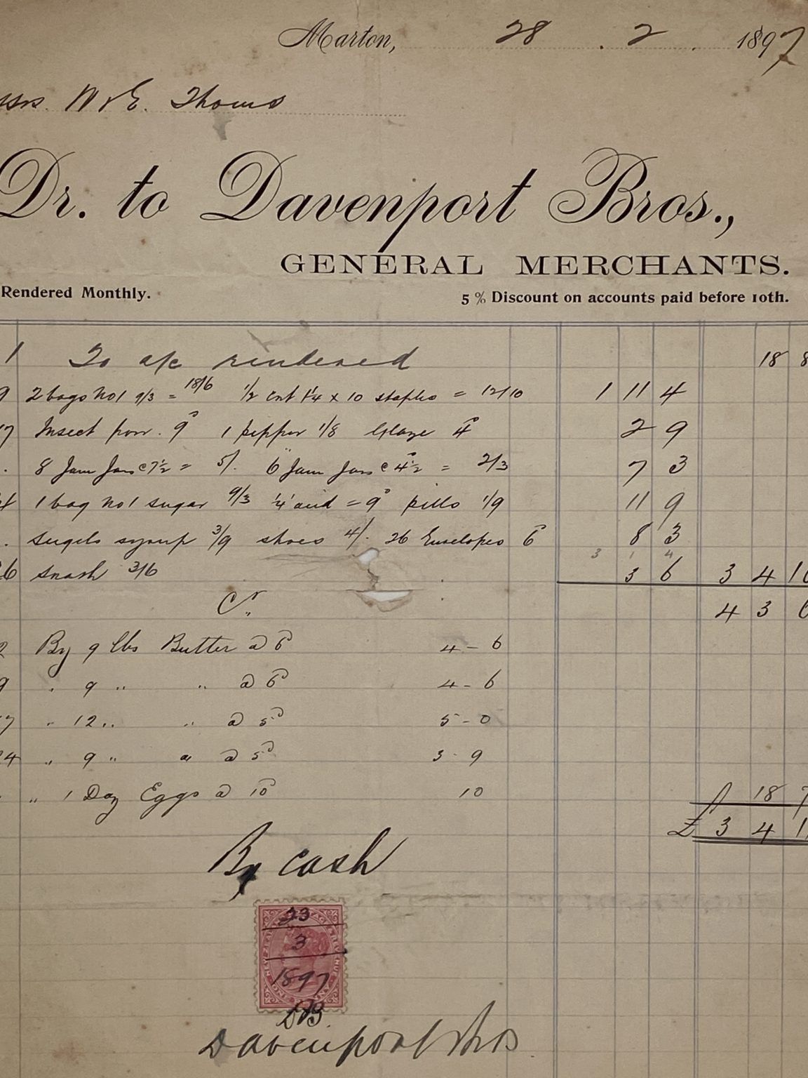 ANTIQUE INVOICE: Davenport Bros, Marton – General Merchants 1897