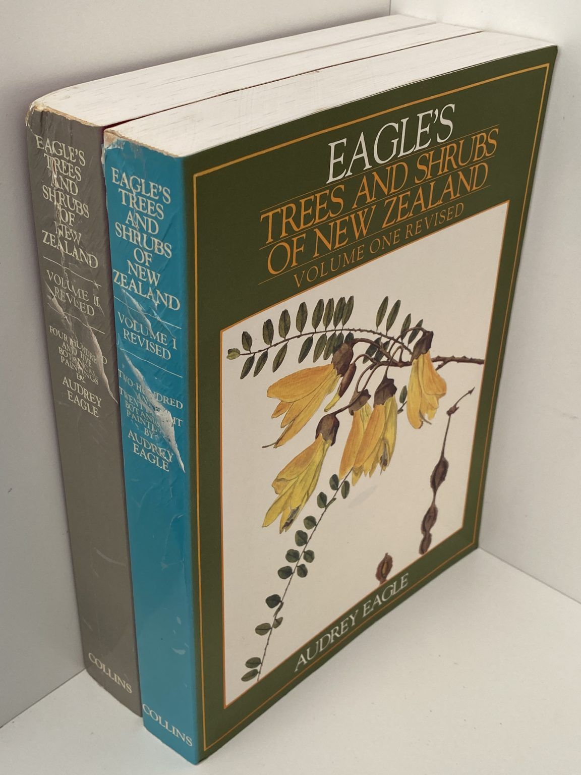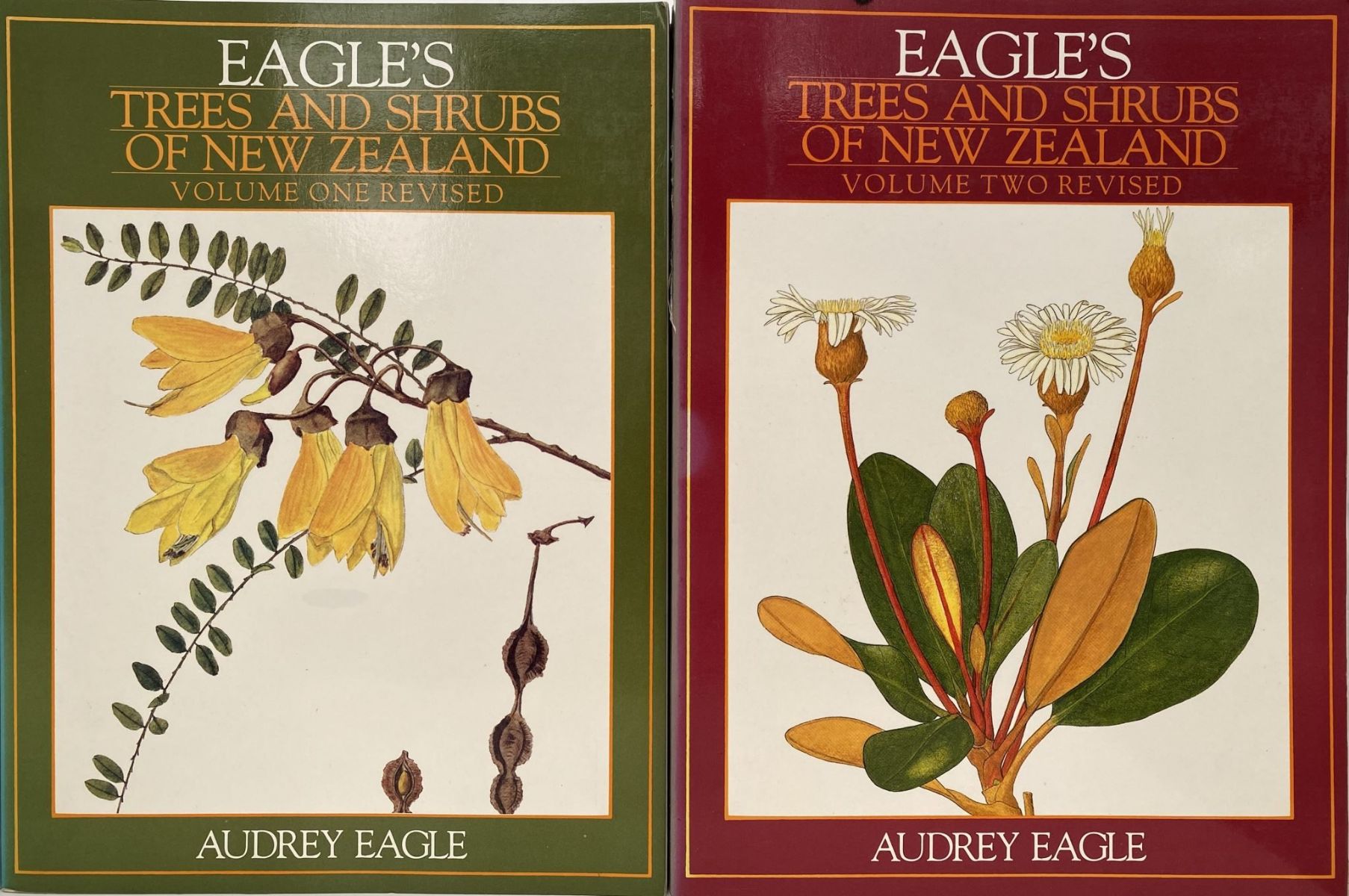 Volume 1: Audrey Eagle painted 228 species collected from all over the New Zealand botanical region and covering all the genera of New Zealand trees and shrubs. The colour paintings, reproduced about life size, show the twig, leaves, flowers and fruit or nut. In some cases, enlarged paintings of individual blooms are included to emphasize botanical details. The botanical notes are succinct, clear and methodical.