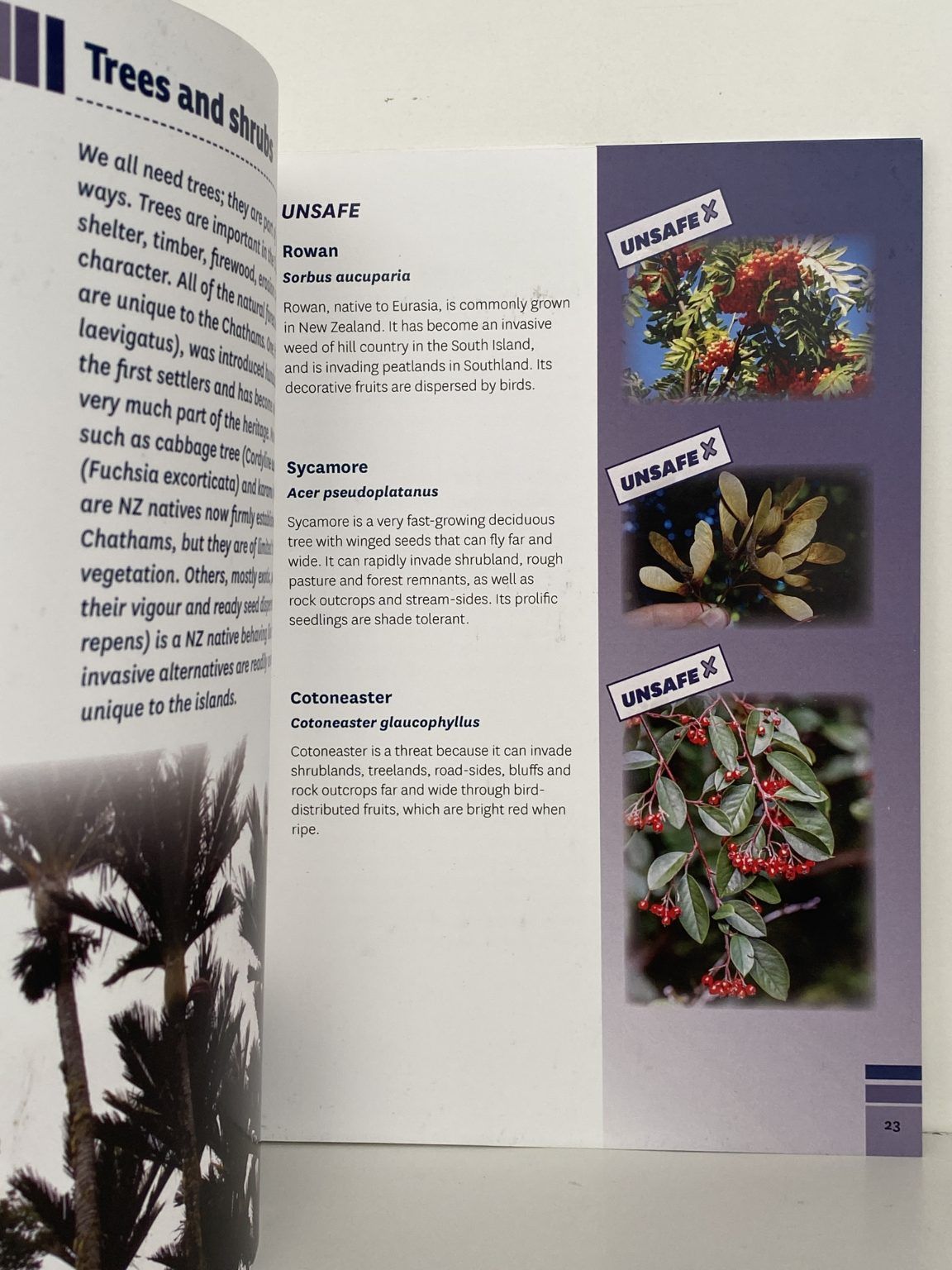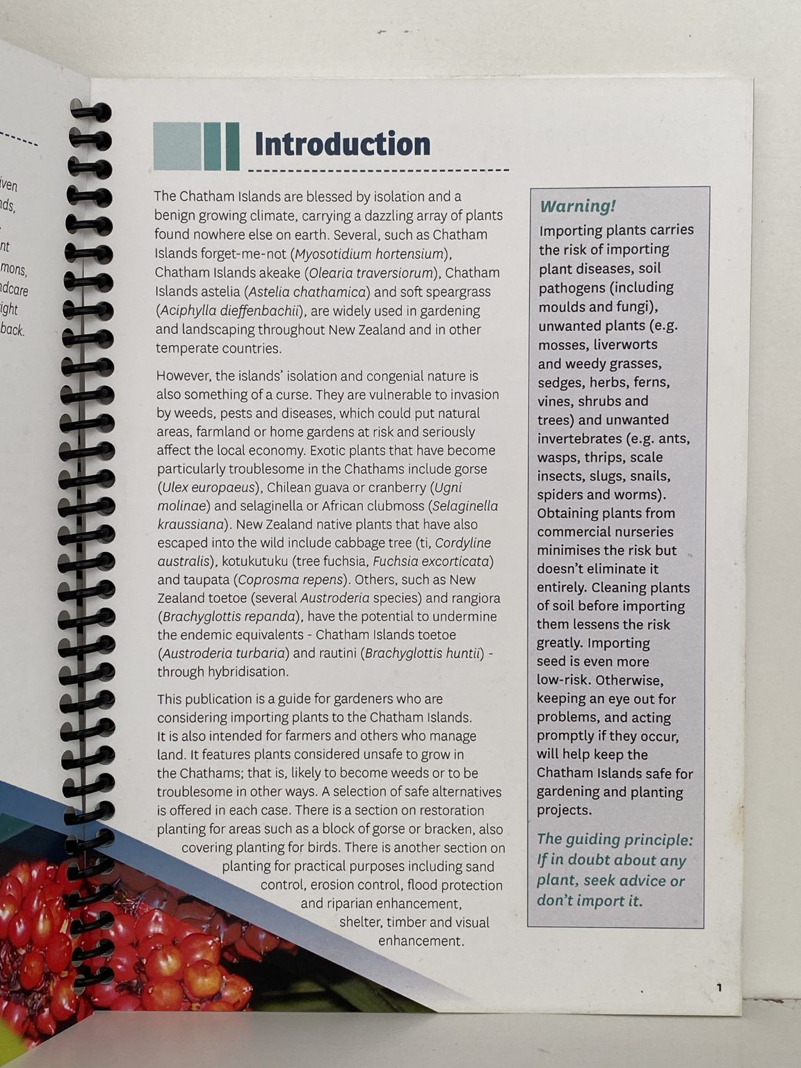 The Chatham Islands are isolated and a benign growing climate and carry an array of plants found nowhere else on earth. this isolation makes the islands vulnerable to invasion by weeds, pests and diseases. It features plants considered unsafe to grow in the Chatham's and provides safe alternatives.