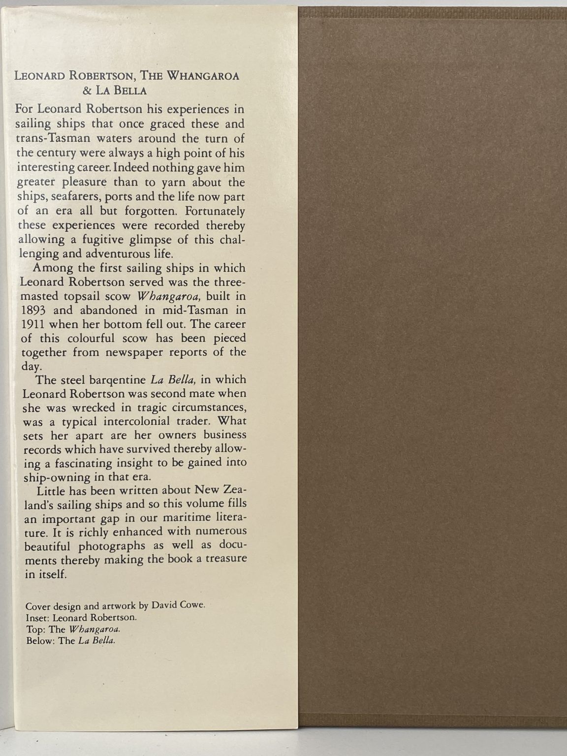 The experiences of Leonard Robertson in intercolonial sailing ships with special references to the scow Whangaroa and barquentine La Bella. For Leonard Robertson his experiences in sailing ships that once graced these trans-Tasman waters around the turn of the century were always a high point of his interesting career.
