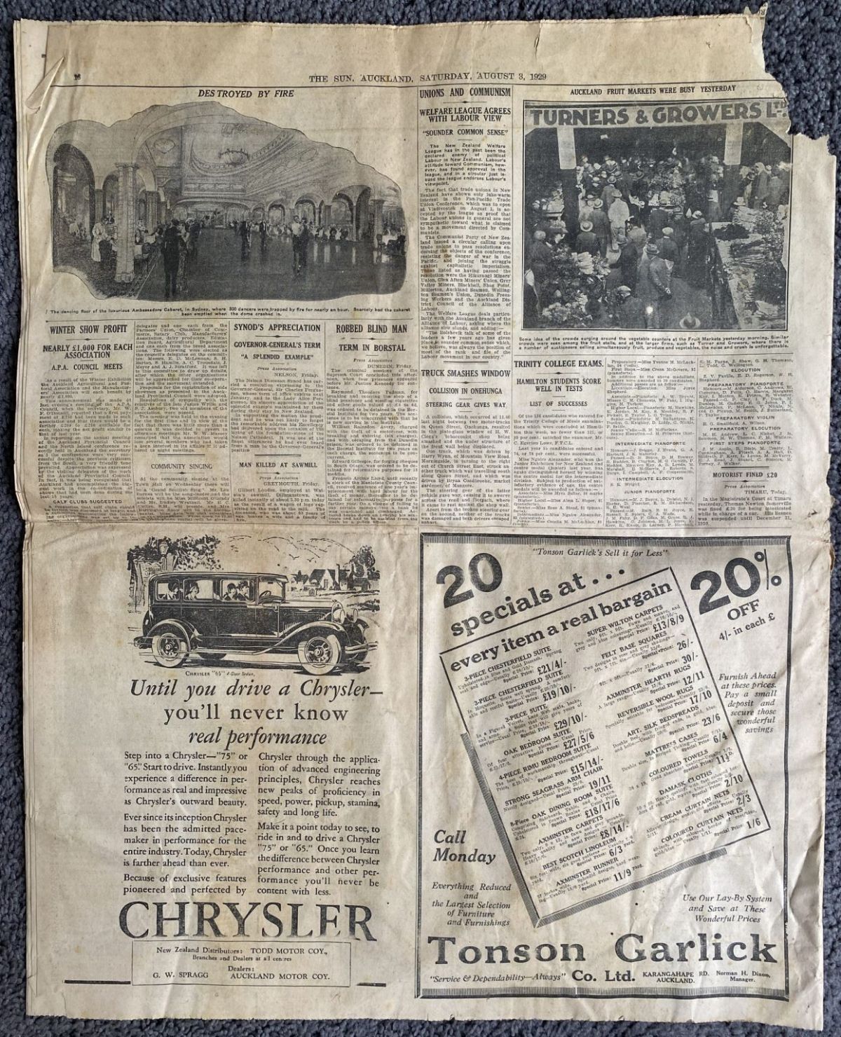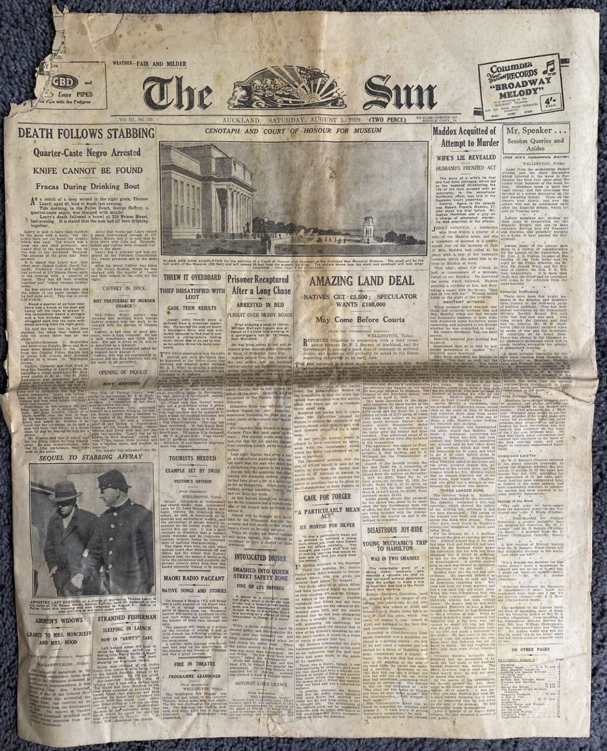 Vintage edition of the The Auckland Sun newspaper from 96+ years ago.