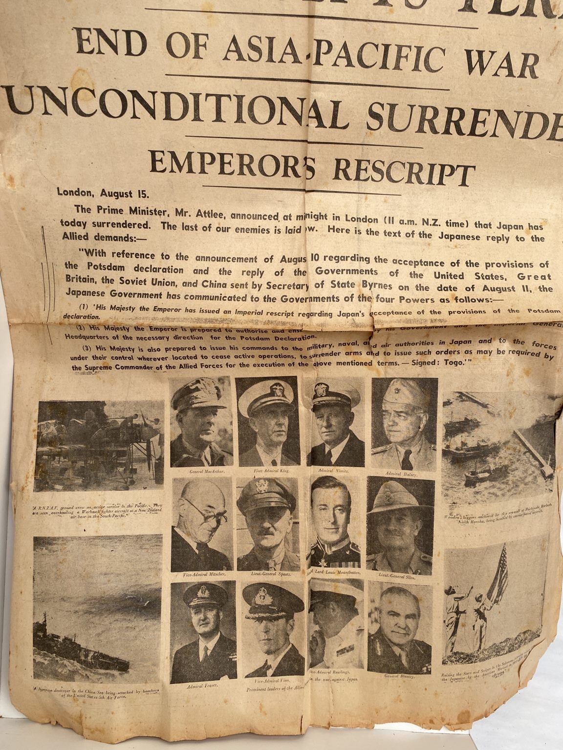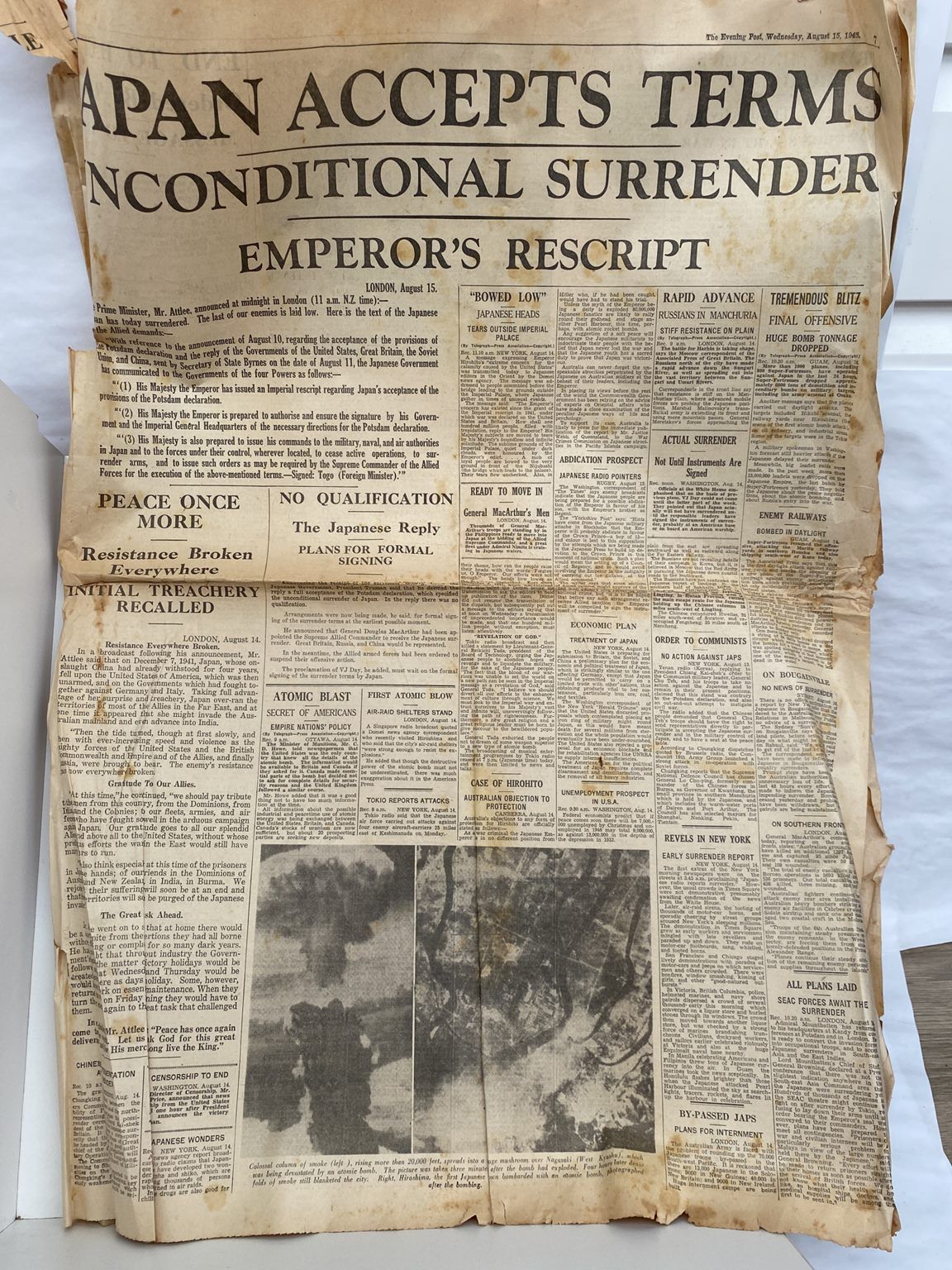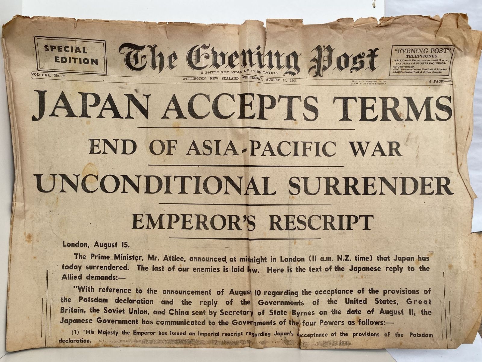 OLD NEWSPAPER: The Evening Post, Wellington 15 August 1945 - Japan Surrenders