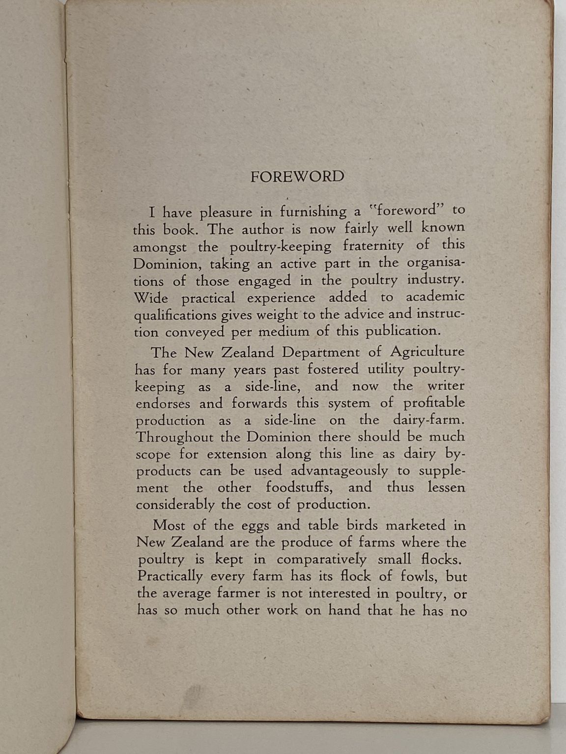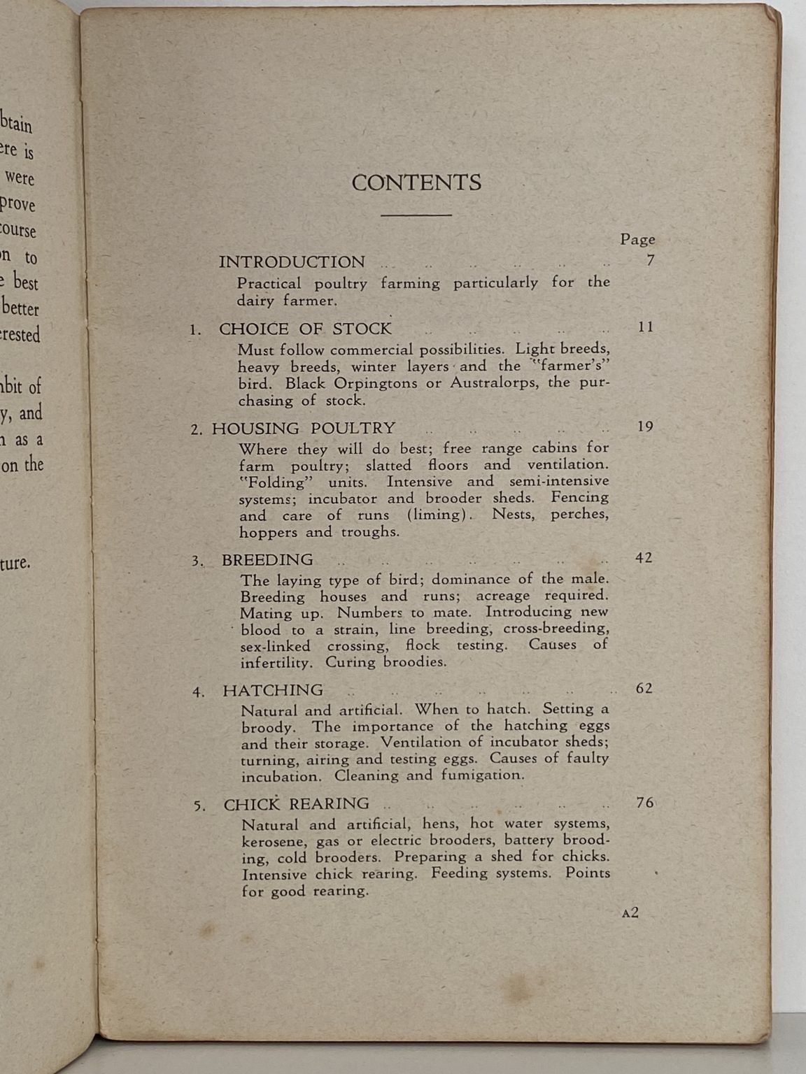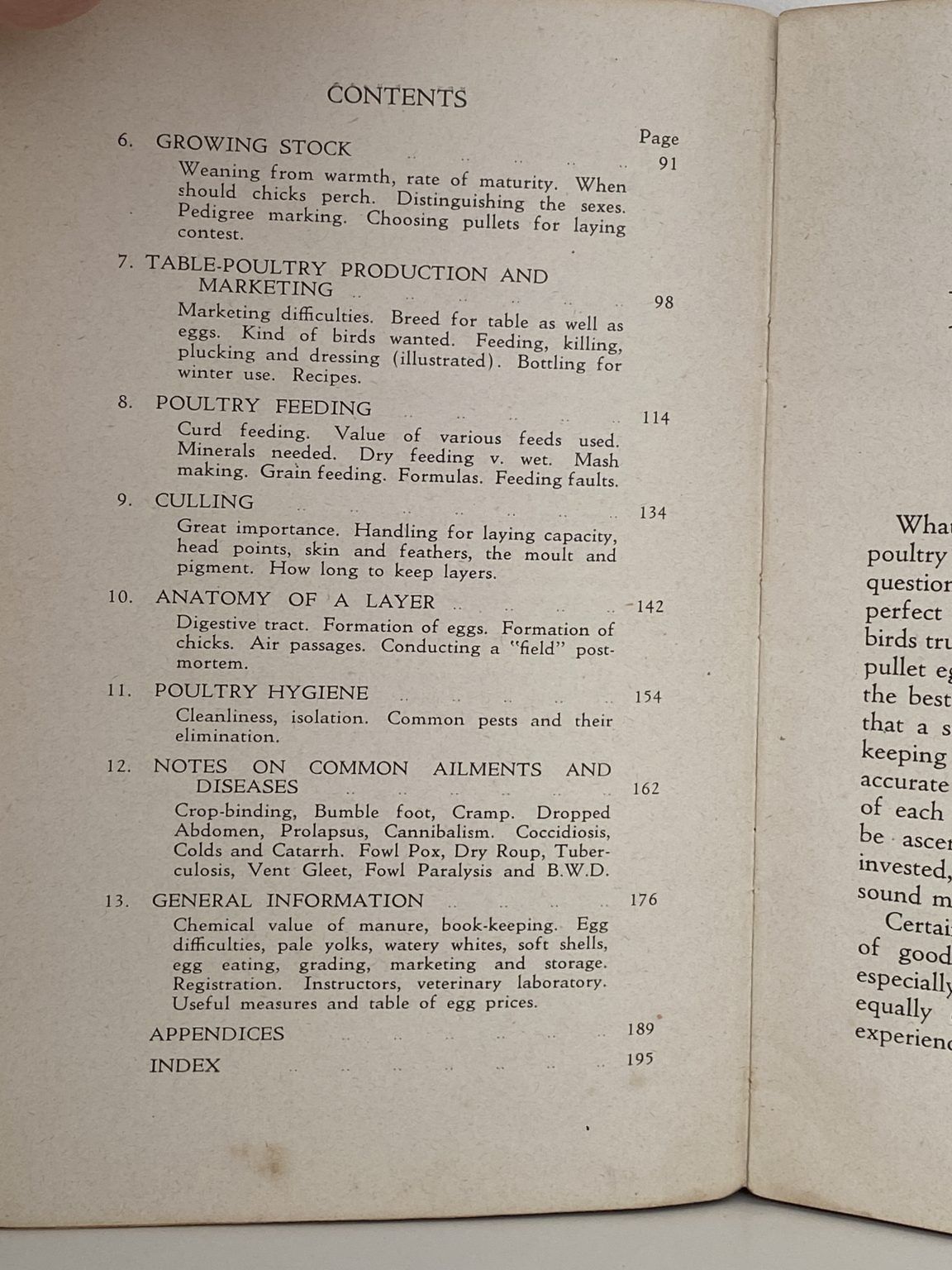 Chapters include: Hatching: Natural and Artificial; Chick Rearing: Natural and Artificial; Growing Stock; Table-Poultry Production and Marketing; Poultry Feeding; Culling; Anatomy of a Layer, and Simple Examination for Disease; Poultry Hygiene; Notes on Common Ailments and Diseases of Poultry.