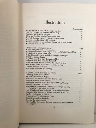 Phyllis Brusey, director of the NZ Opera Company and chairman of the Maori Theatre Trust. Antiques and opera have enriched the life of Phyllis Brusey and here she has recaptured some of the atmosphere of wonderful years as an antique dealer and of the exciting successes of the NZ Opera Company, with which she was closely associated. A close family link with early missionary days in New Zealand has enabled Mrs Brusey also to include in her book some absorbing incidents of those times, as recorded in her grandfather's diaries and letters. Her own unusual travel encounters and experiences add to the book's interesting and varied content.