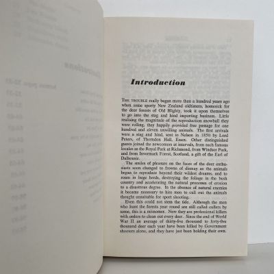 Here's a crackling account of the doings of "Government Deer Shooting Party Number Six" - in the bush and in the city. Canadian Ron Helmer takes you into the Urewera country with the deer hunters, up razorbacks, across roaring streams, through back-breaking bush. You look along his rifle sites at graceful deer and savage boars and you see big rainbow trout lazing in the river pools. You wonder at the grandeur of the New Zealand wilds, described so freshly and arrestingly.