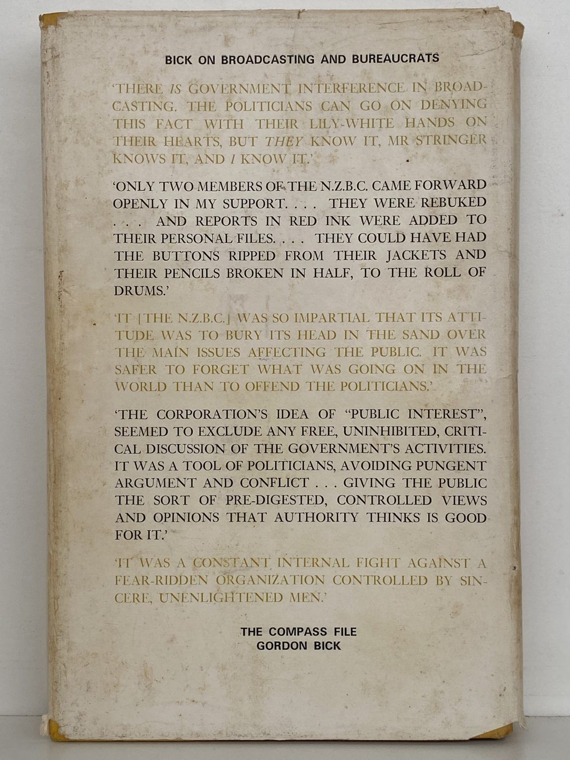 Gordon Bick resigned because he was certain that only government pressure, indirectly applied, prevented the televising of a Compass programme on the conversion to decimal currency. In an election year the Government wanted to avoid a programme that might suggest an increase in prices for consumer goods. While Parliamentary and newspaper debate raged-Gordon Bick, jobless, looked back on his period with the N.Z.B.C. and considered just how timorously the Corporation had used its so-called independence.