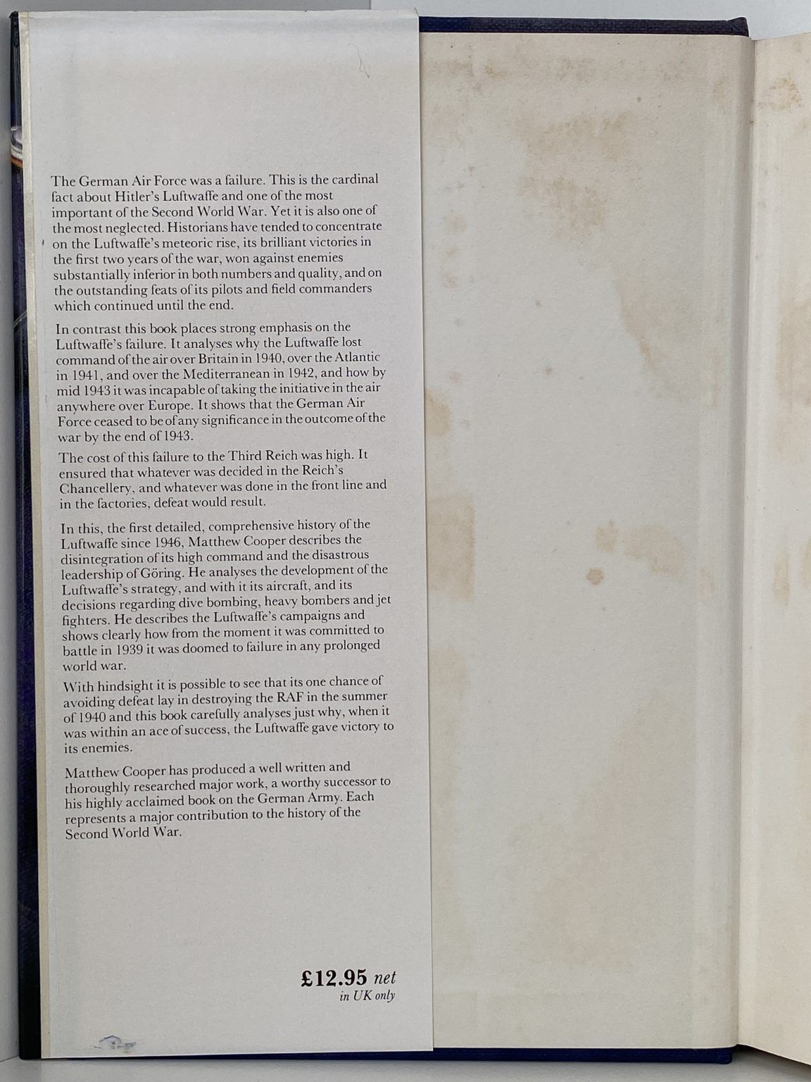 Analyses why the Luftwaffe lost Command of the Air over Britain in 1940, over the Atlantic in 1941, over the Mediterranean in 1942 and why it ceased to be of any consequence by the end of 1943.