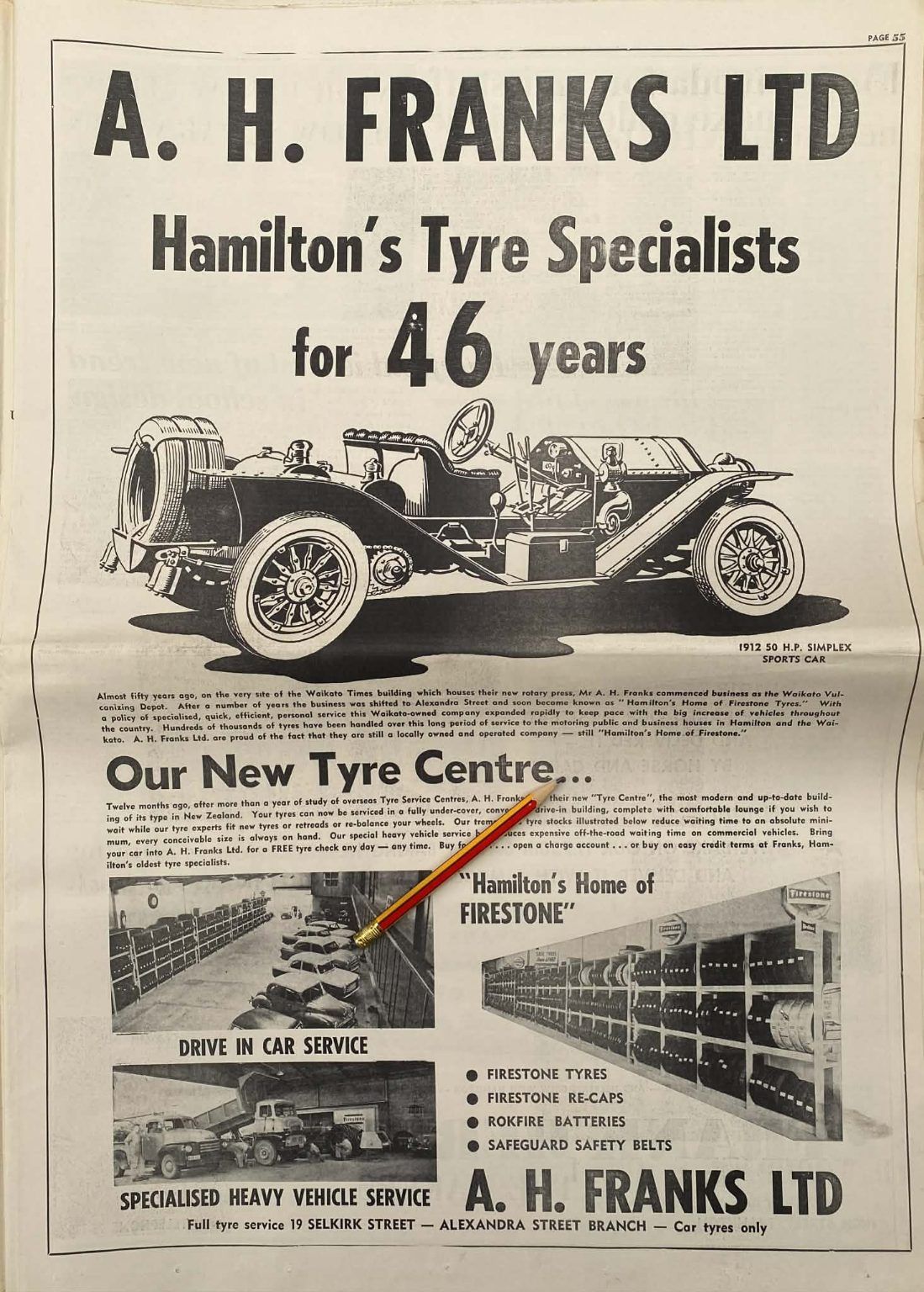 Own a unique piece of Kiwiana - an original full page vintage advert for A.H. Franks Ltd, tyre specialists in Hamilton from a 1964 newspaper that would look fantastic framed.