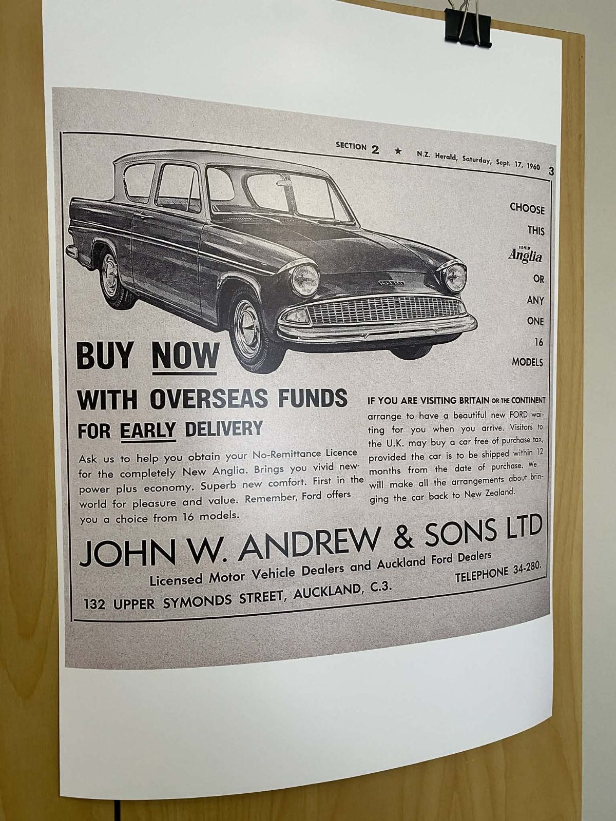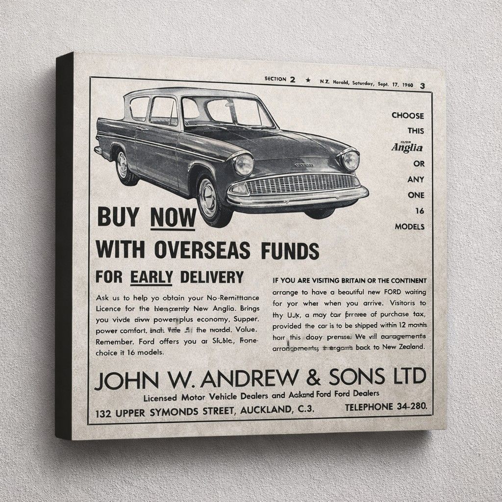 This is a near identical modern reproduction of an original small newspaper advert from 1960 promoting the new Ford Anglia, by the local Ford Dealer; John Andrew and Sons Ltd in Auckland.
