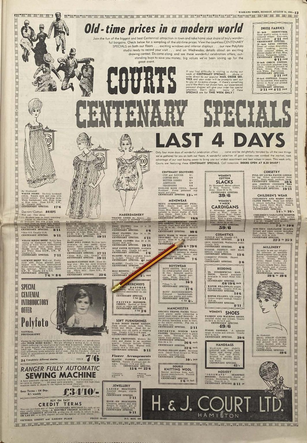 Own a unique piece of Kiwiana - an original full page vintage advert for H & J Court Ltd, Hamilton from a 1964 newspaper that would look fantastic framed.