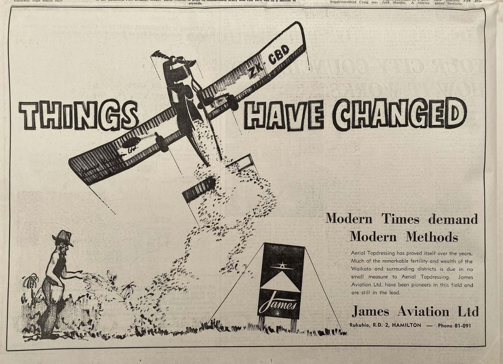Own a unique piece of Kiwiana - an original half page vintage advert for James Aviation in Hamilton from a 1964 newspaper that would look fantastic framed.
