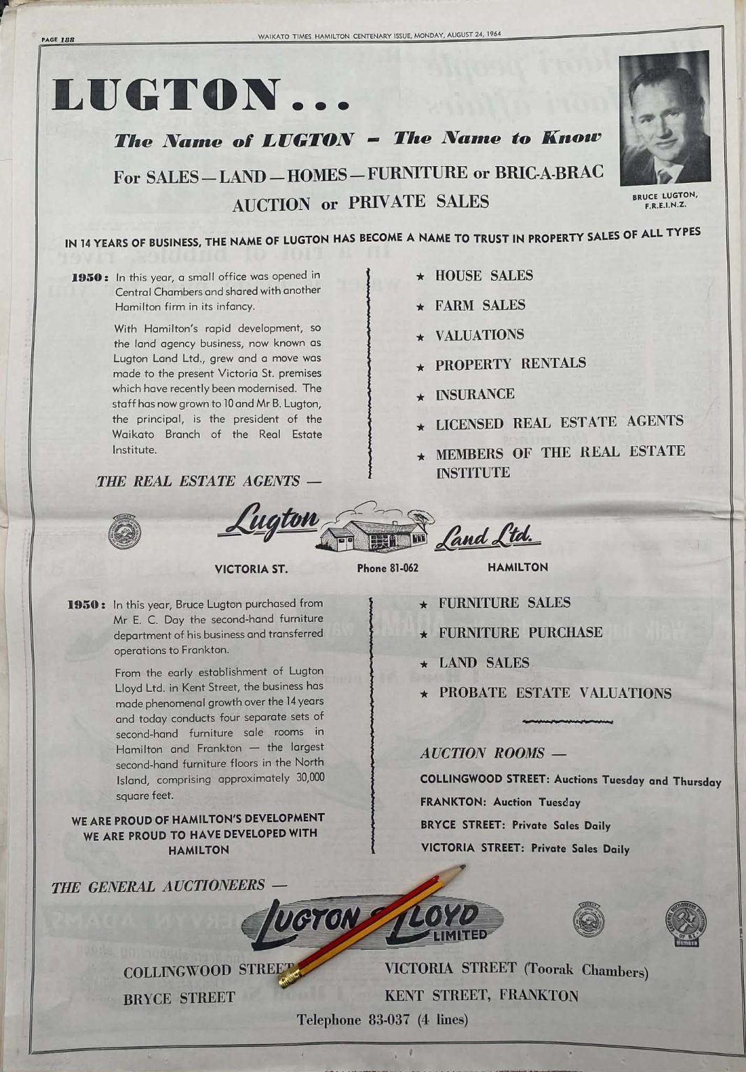 Own a unique piece of Kiwiana - an original full page vintage advert for Lugton and Lloyd Ltd in Hamilton from a 1964 newspaper that would look fantastic framed.