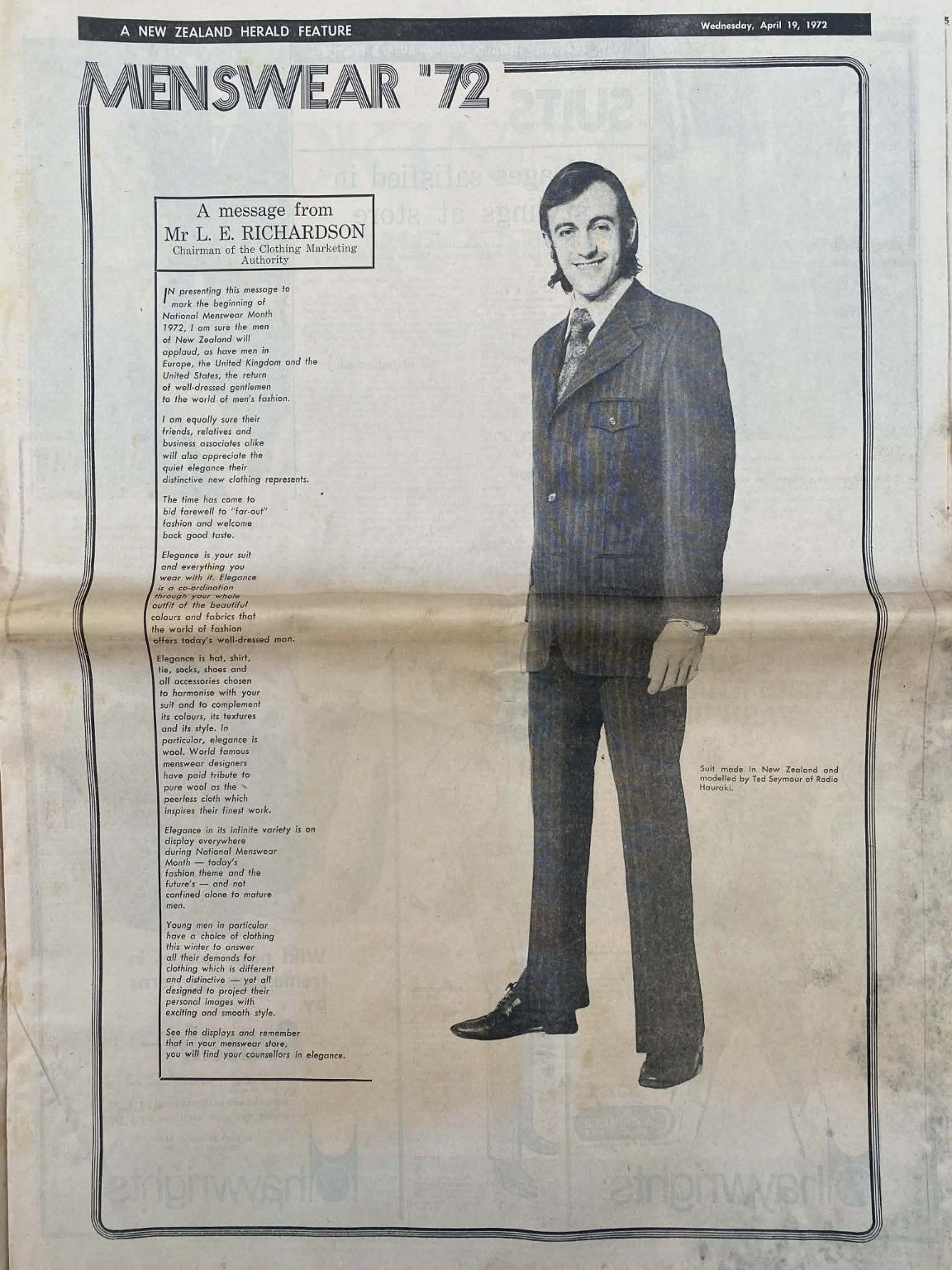 Own a unique piece of Kiwiana - an original full page vintage advert for Pure Wool Suit / National Menswear Month from a 1972 newspaper that would look fantastic framed.