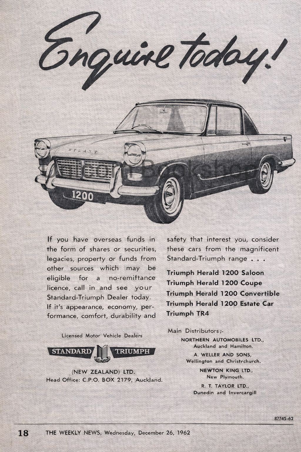 This advert was promoting the all new 1962 Triumph Herald by the local dealer; Standard Triumph in Auckland, and was in the days of overseas currency restrictions in New Zealand.