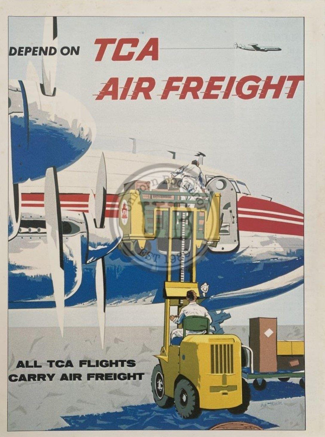 A poster promoting TCA air freight service that later changed its name to Air Canada North Star, depicts a Douglas DC-4 or DC-6 aircraft being loaded with a forklift.