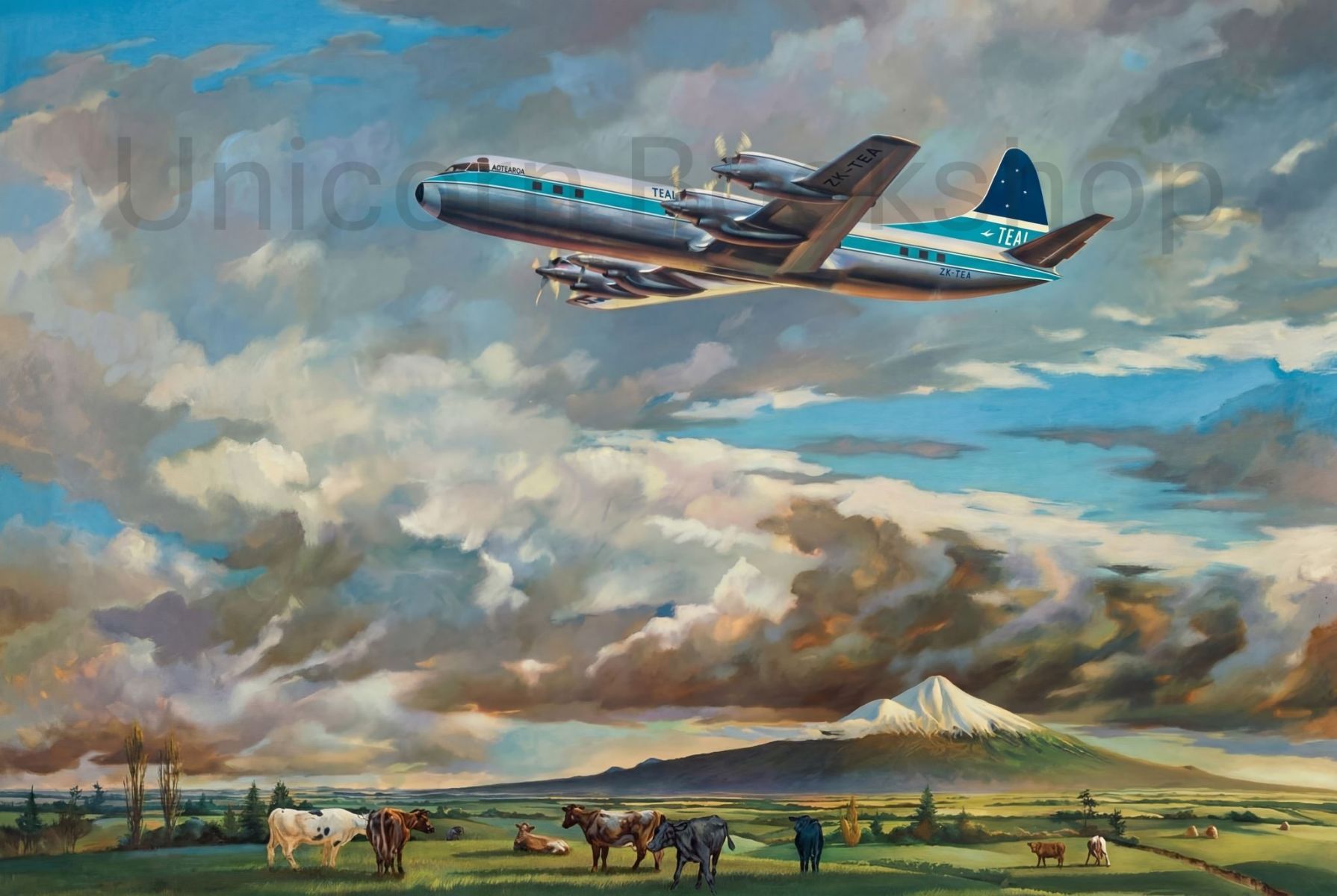 This is a modern reproduction of an original watercolour from circa 1954. Lockheed Electra ZK-TEA was the first of three aircraft ordered new by Tasman Empire Airways Ltd.