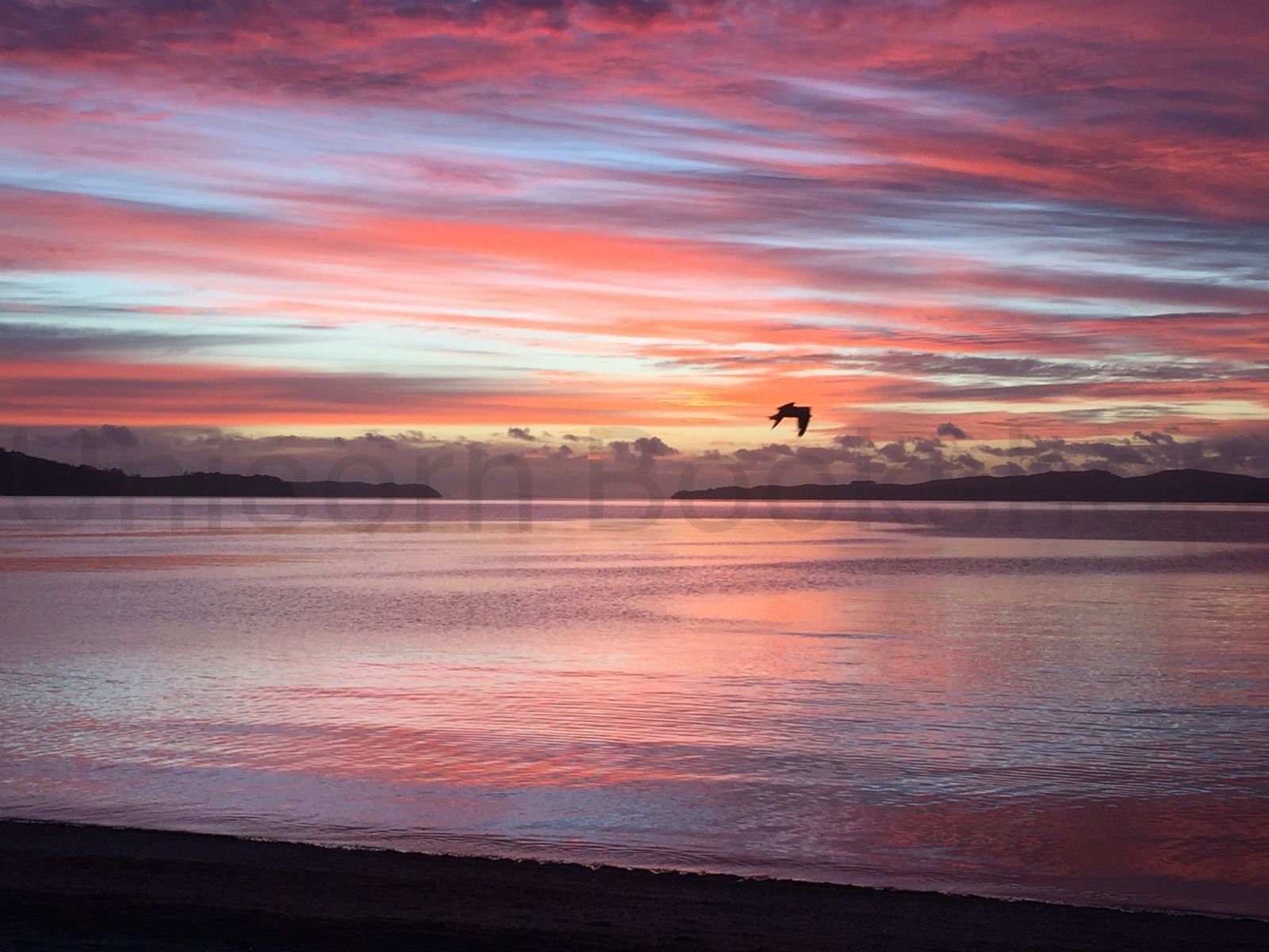 This is an early sunrise at 6.45am Snells Beach, North Auckland looking out past Kawau Island towards Great Barrier Island on the horizon, that captured a seagull in flight mid-frame.