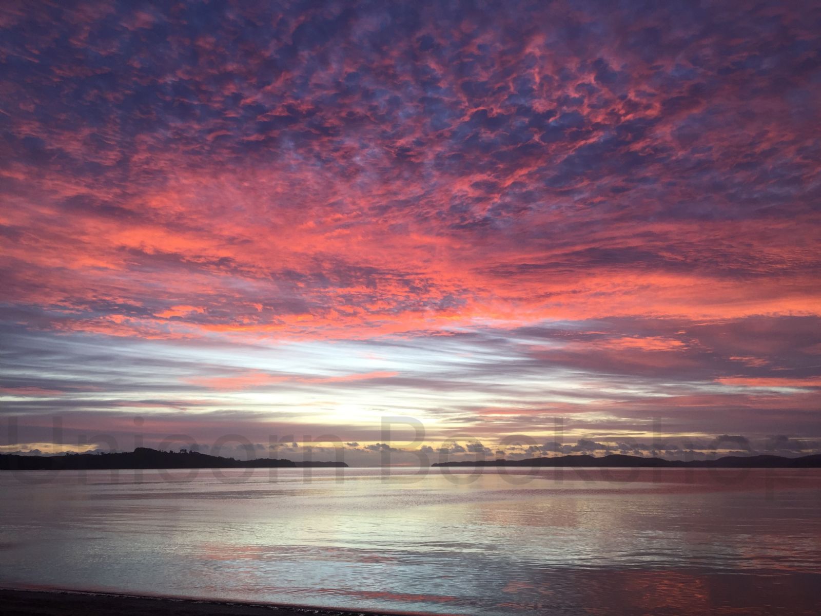 This is an early sunrise at 6.45am Snells Beach, North Auckland looking out past Kawau Island towards Great Barrier Island on the horizon.