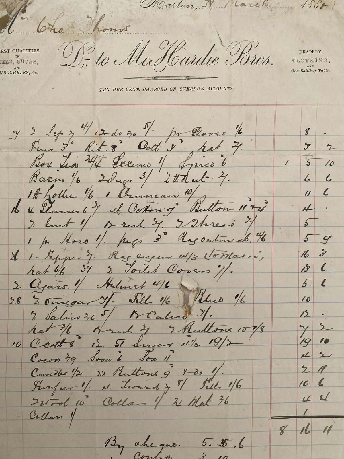 ANTIQUE INVOICE: McHardie Bros, Marton - Groceries, Drapery and Clothing 1882