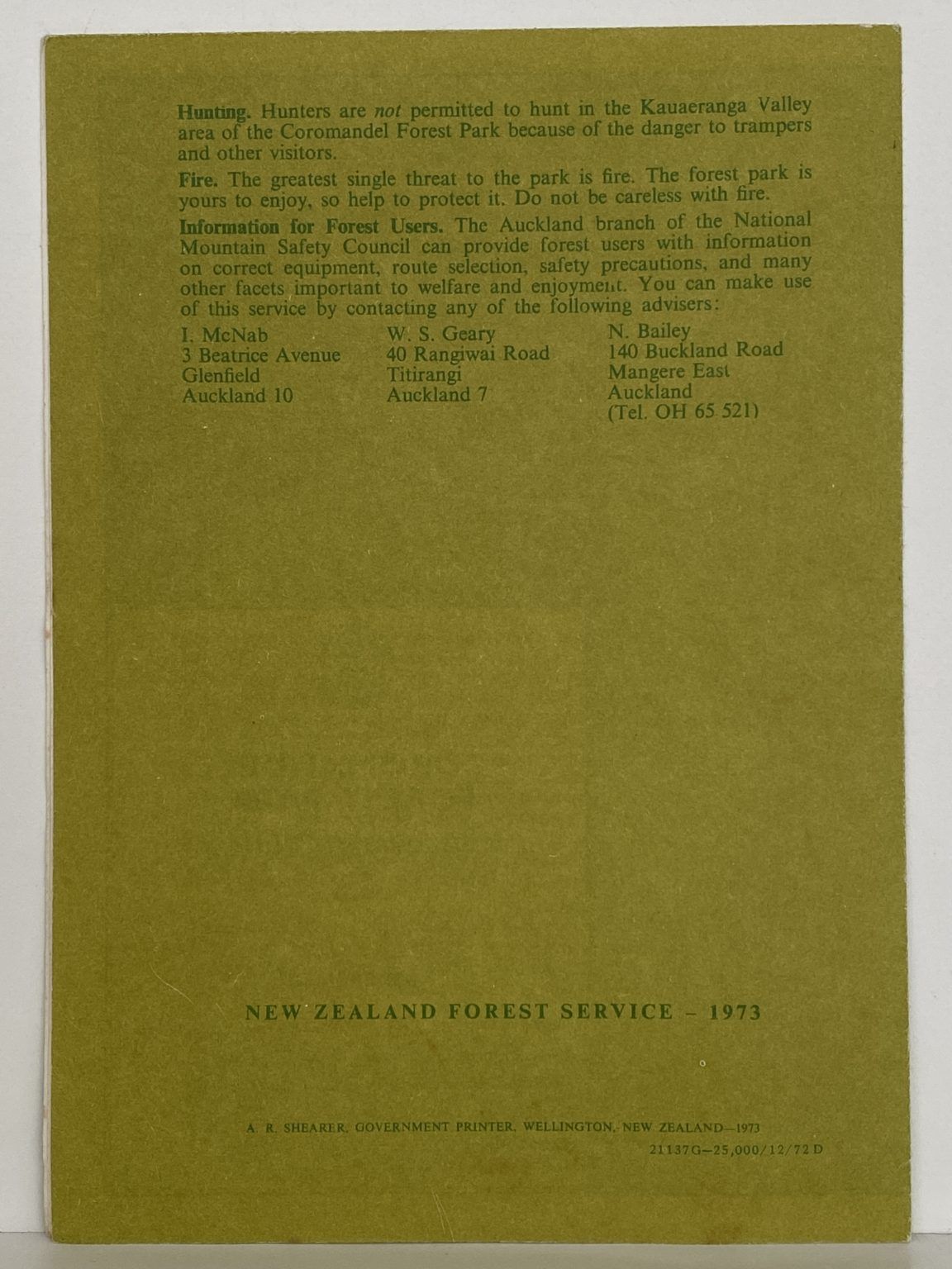 Vintage guide and map to the Kauaeranga Valley Forest Park in the Coromandel region.