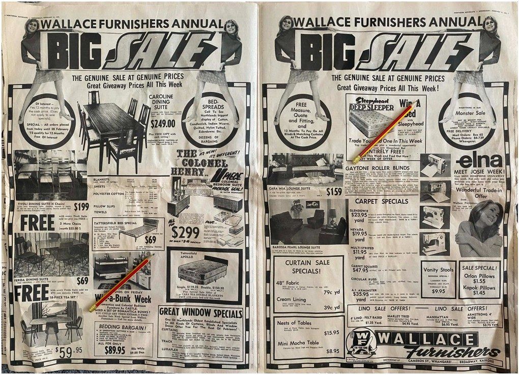 Own a unique piece of Kiwiana - an original double full page advert for Wallace Furnishers, Whangarei Annual Sale from a 1973 newspaper that would look fantastic framed.