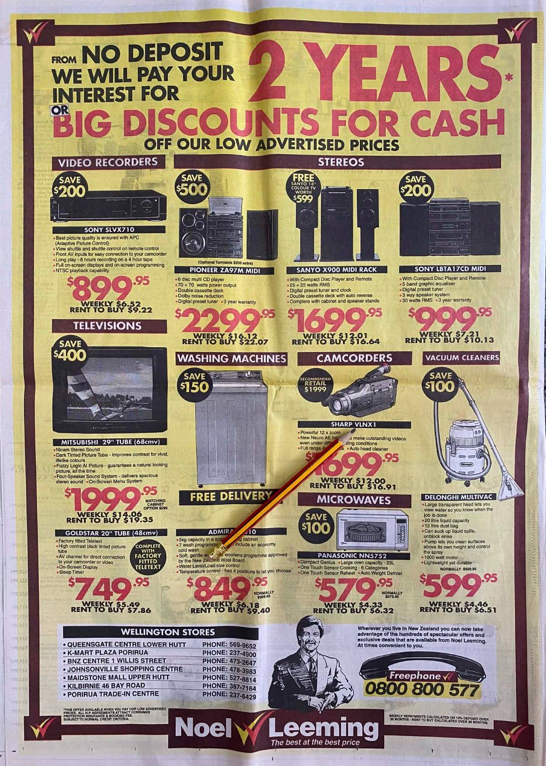 Own a unique piece of Kiwiana - an original full page advert for Noel Leeming Wellington from a 1994 newspaper that would look fantastic framed.