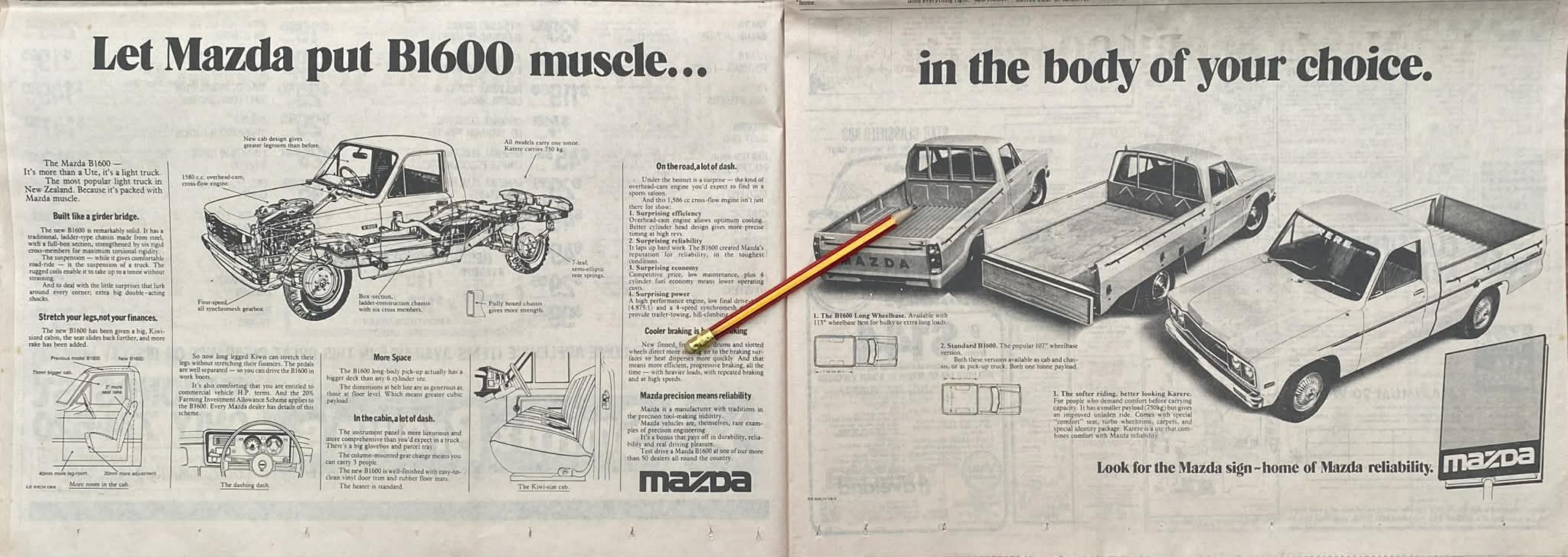 Own a unique piece of Kiwiana - an original full double page advert for Mazda B1600 Ute from a 1980 newspaper, that would look fantastic framed.