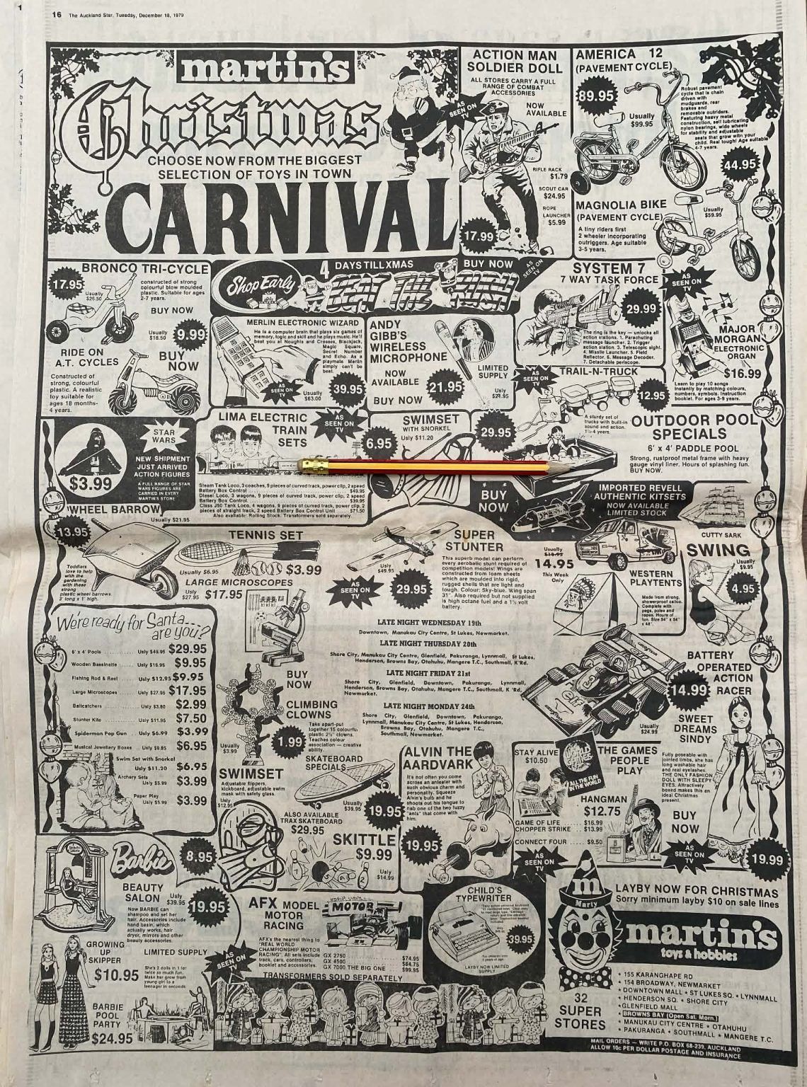 Own a unique piece of Kiwiana - an original full page advert for Martin's Toys and Hobbies from a 1979 newspaper that would look fantastic framed.