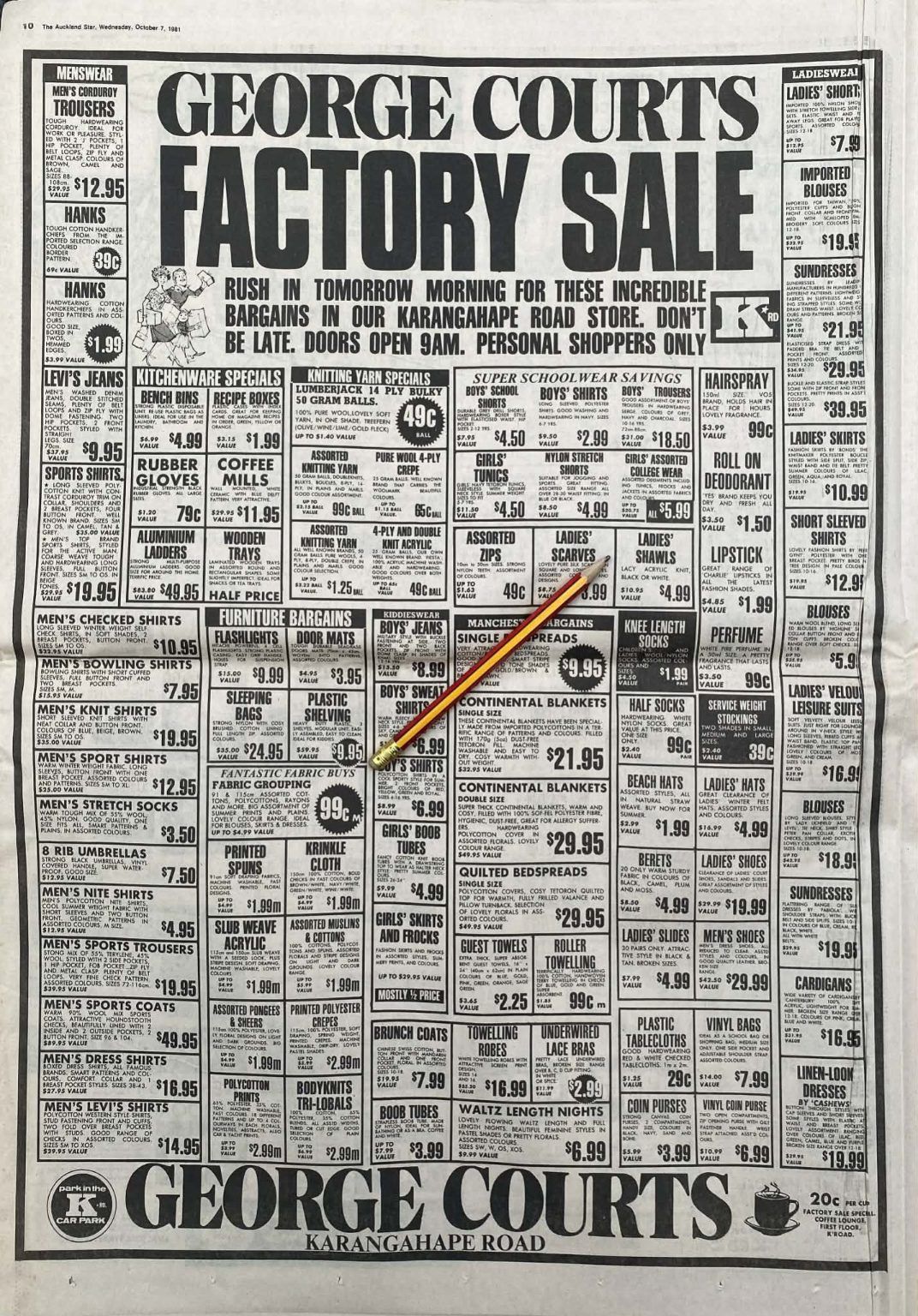 Own a unique piece of Kiwiana - an original full page advert for George Courts from a 1981 newspaper, that would look fantastic framed.