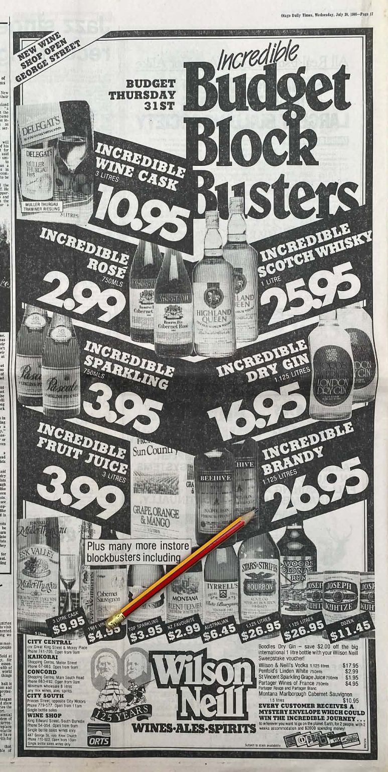 Own a unique piece of Kiwiana - an original half page advert for Wilson Neil Wines and Spirits from a 1986 newspaper that would look fantastic framed.
