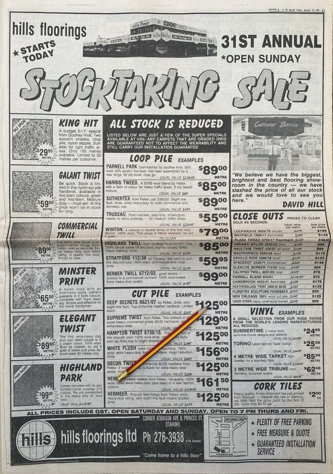 Own a unique piece of Kiwiana - an original full page advert for Hills Floorings from a 1991 newspaper, that would look fantastic framed.