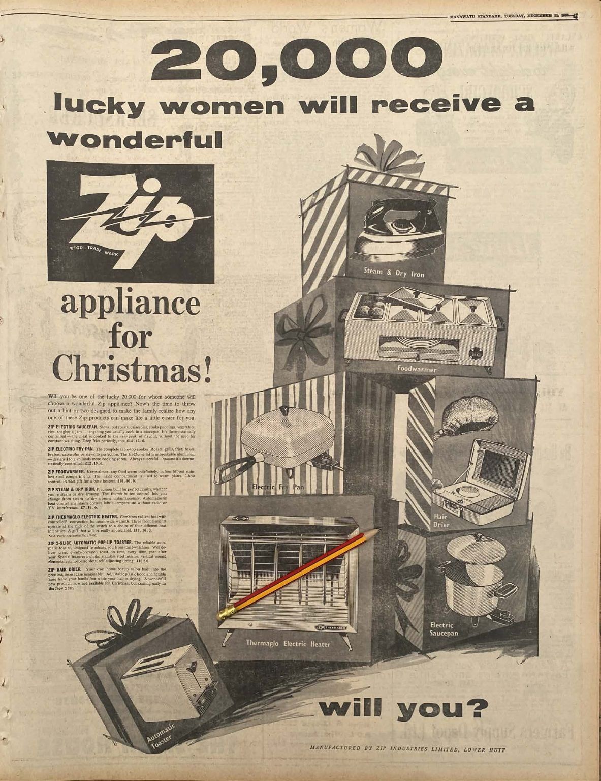 Own a unique piece of Kiwiana - an original full page advert for Zip Appliances from a 1962 newspaper that would look fantastic framed.