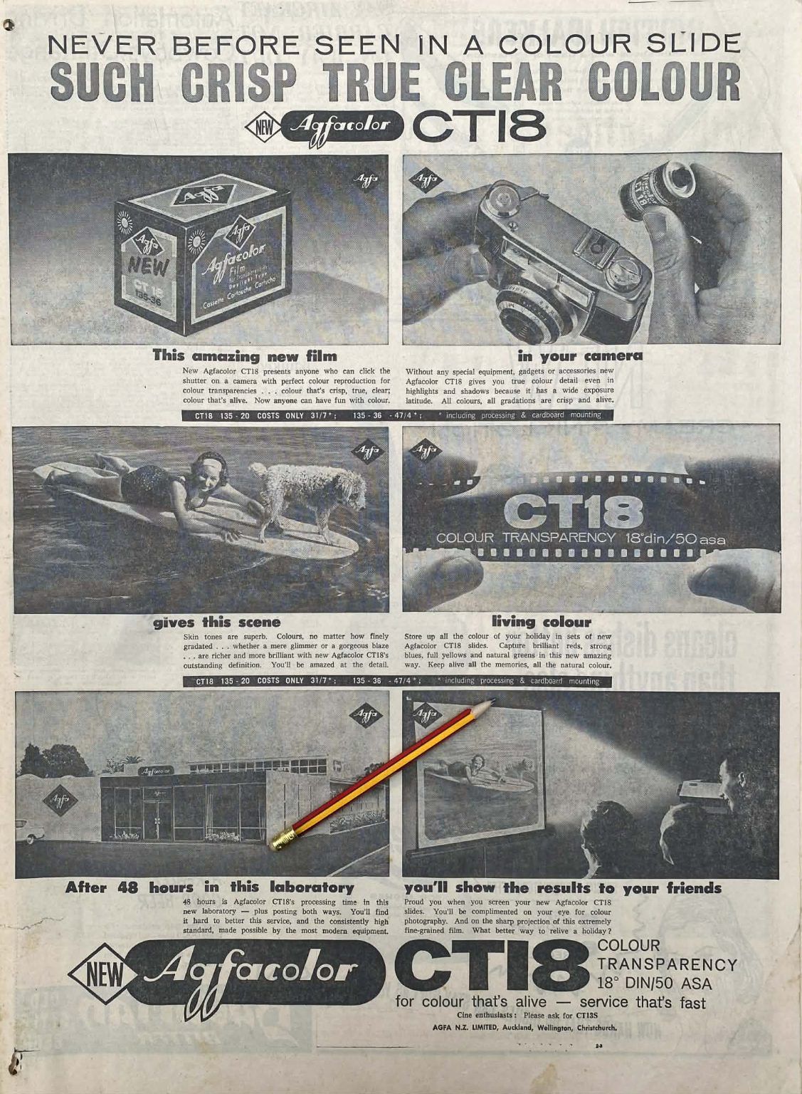 Own a unique piece of Kiwiana - an original full page advert for new Agfacolor CT18 film from a 1963 newspaper that would look fantastic framed.