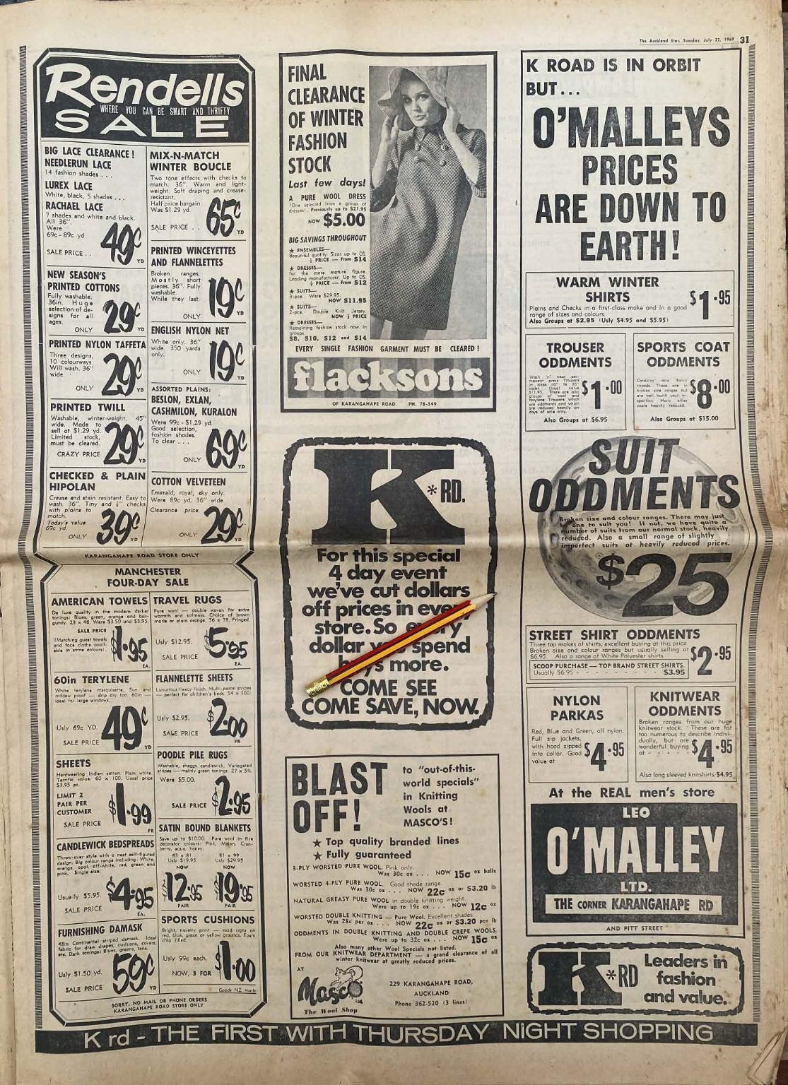 VINTAGE NEWSPAPER ADVERT: K-Road Come Save now 1969