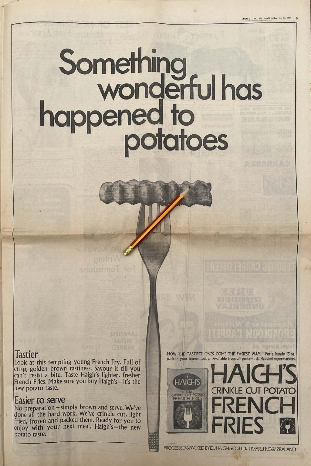 Own a unique piece of Kiwiana - an original full page vintage advert for Haigh's French Fries from a 1969 newspaper that would look fantastic framed.