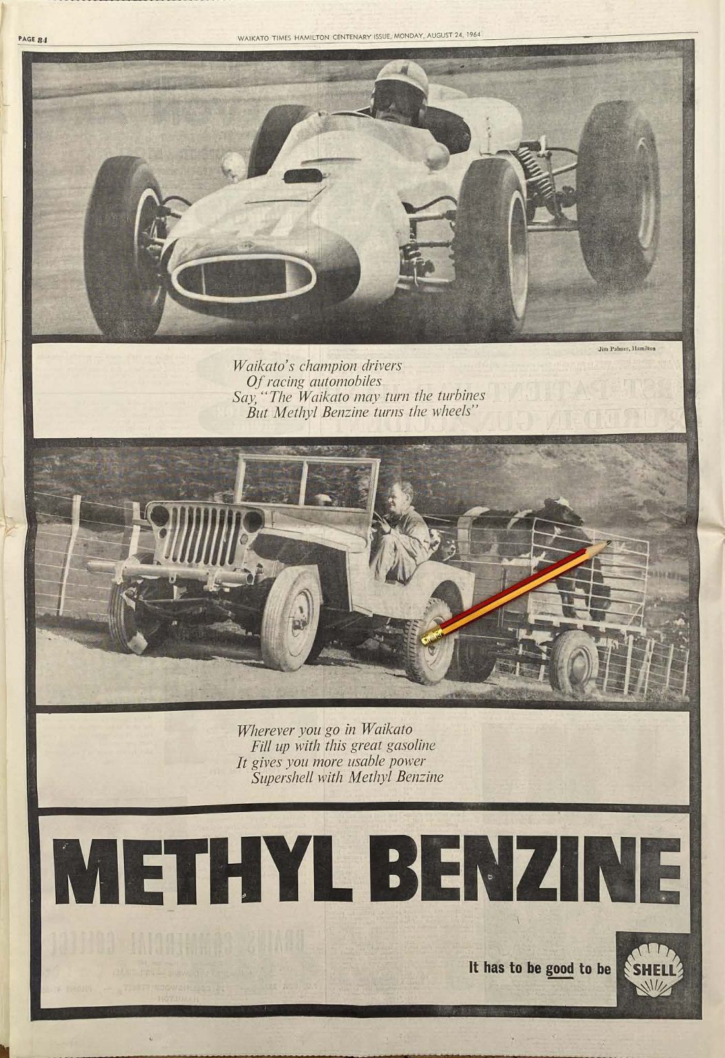 Own a unique piece of Kiwiana - an original full page vintage advert for Shell Methyl Benzine from a 1964 newspaper that would look fantastic framed.