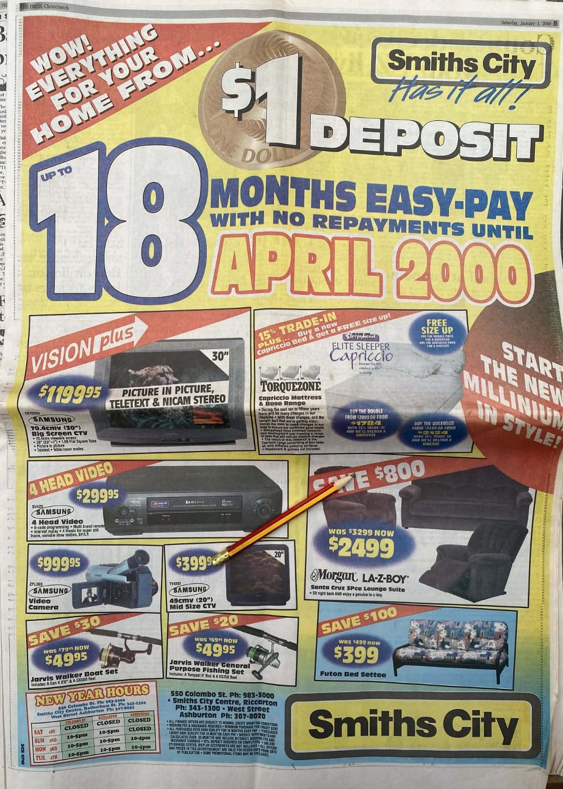 Own a unique piece of Kiwiana - an original full page vintage advert for Smiths City in Christchurch from a 2000 newspaper that would look fantastic framed.