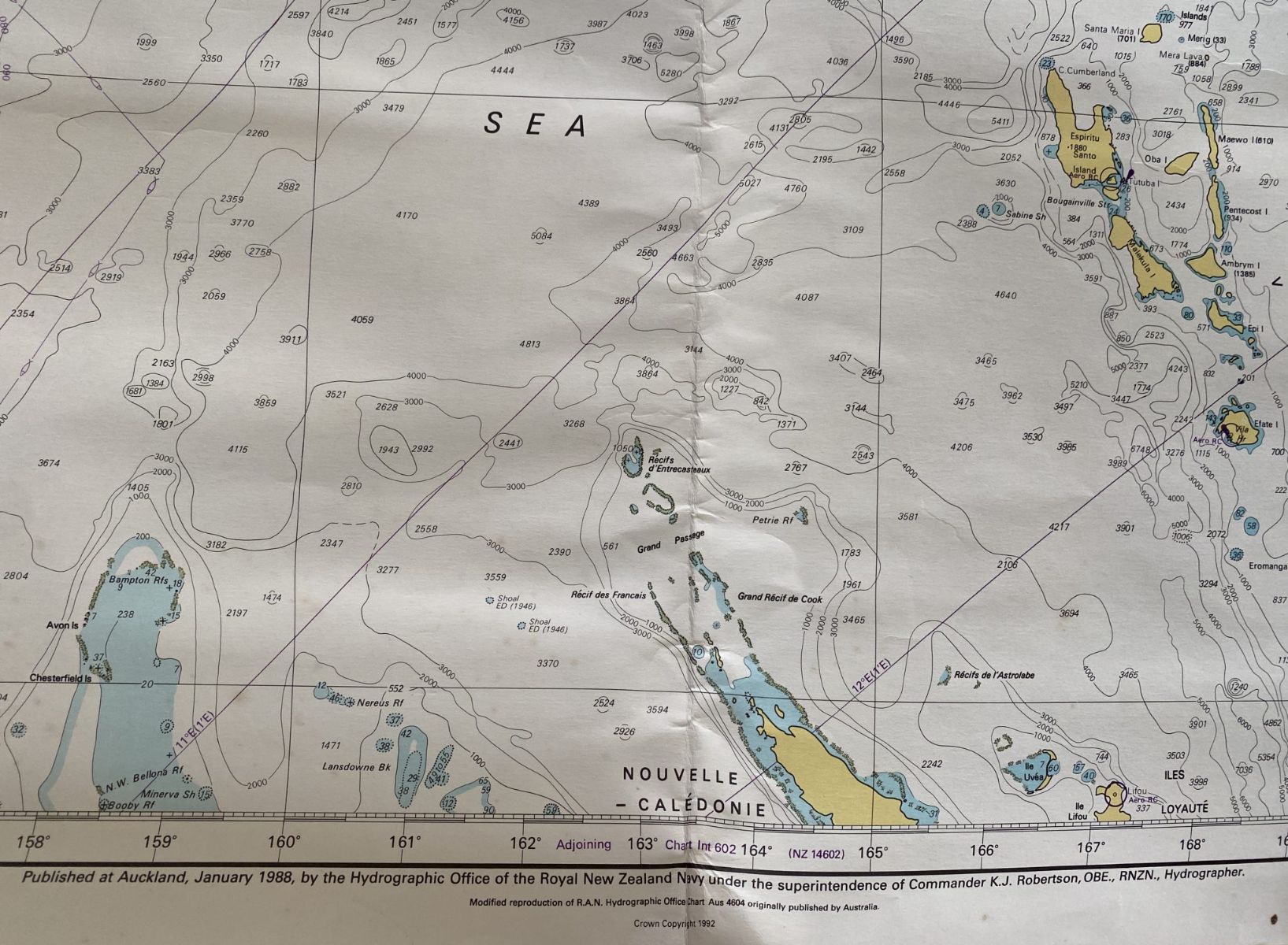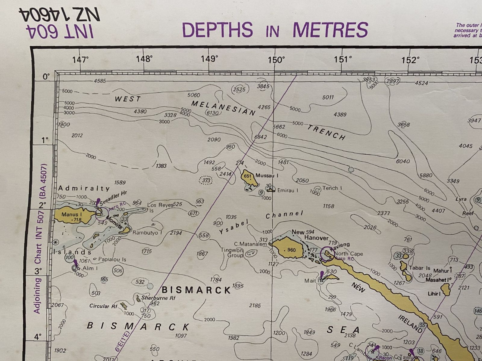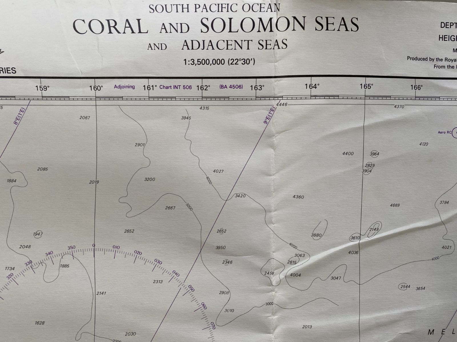 Vintage Admiralty Chart of Coral and Solomon Seas and Adjacent Seas, from 46+ years ago.