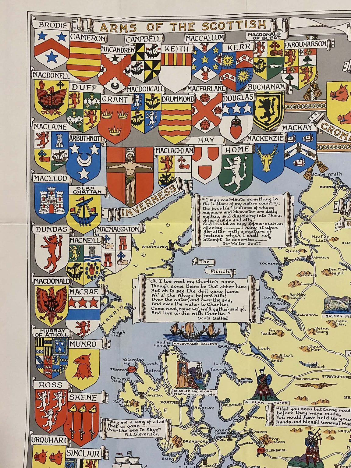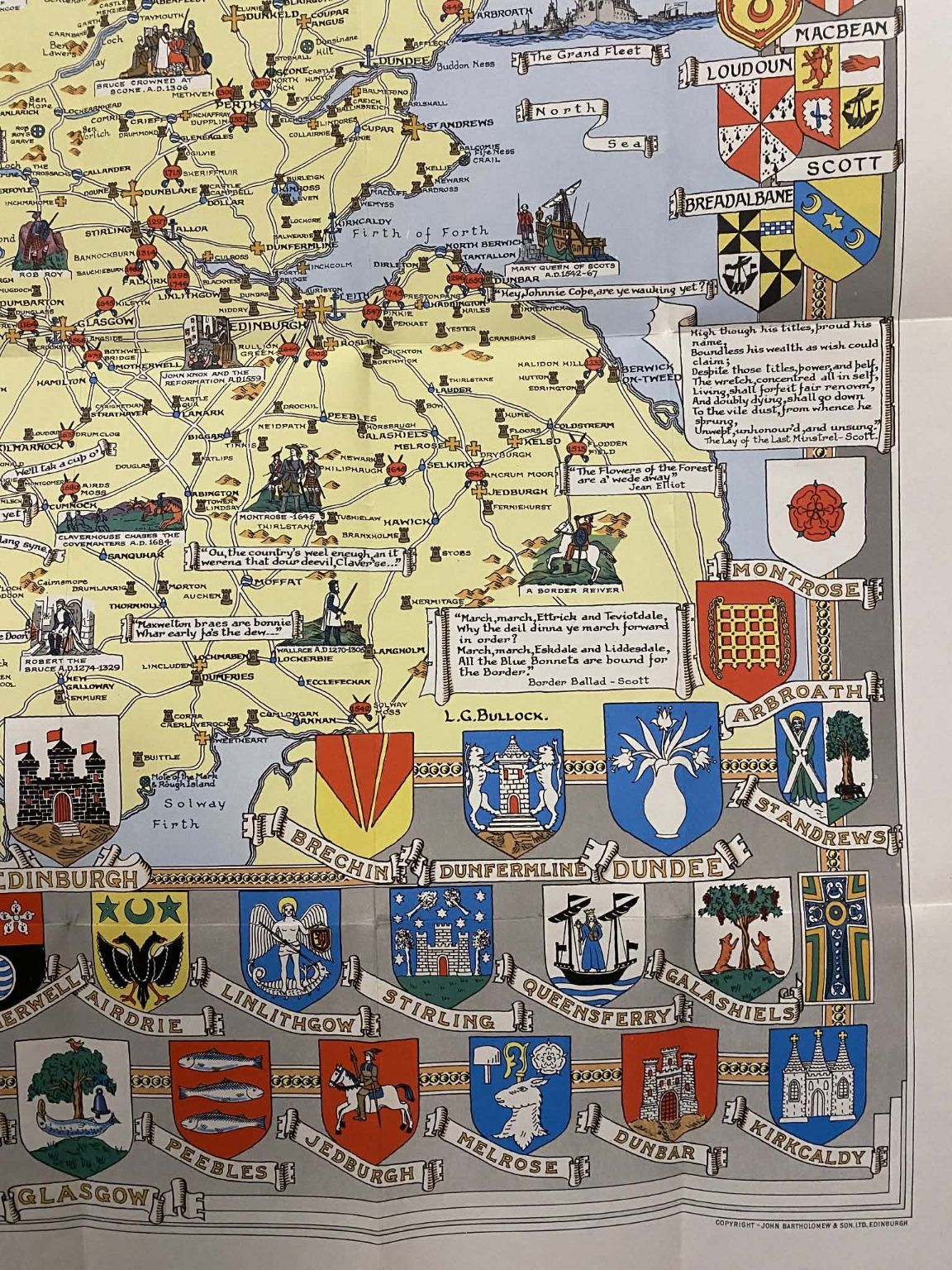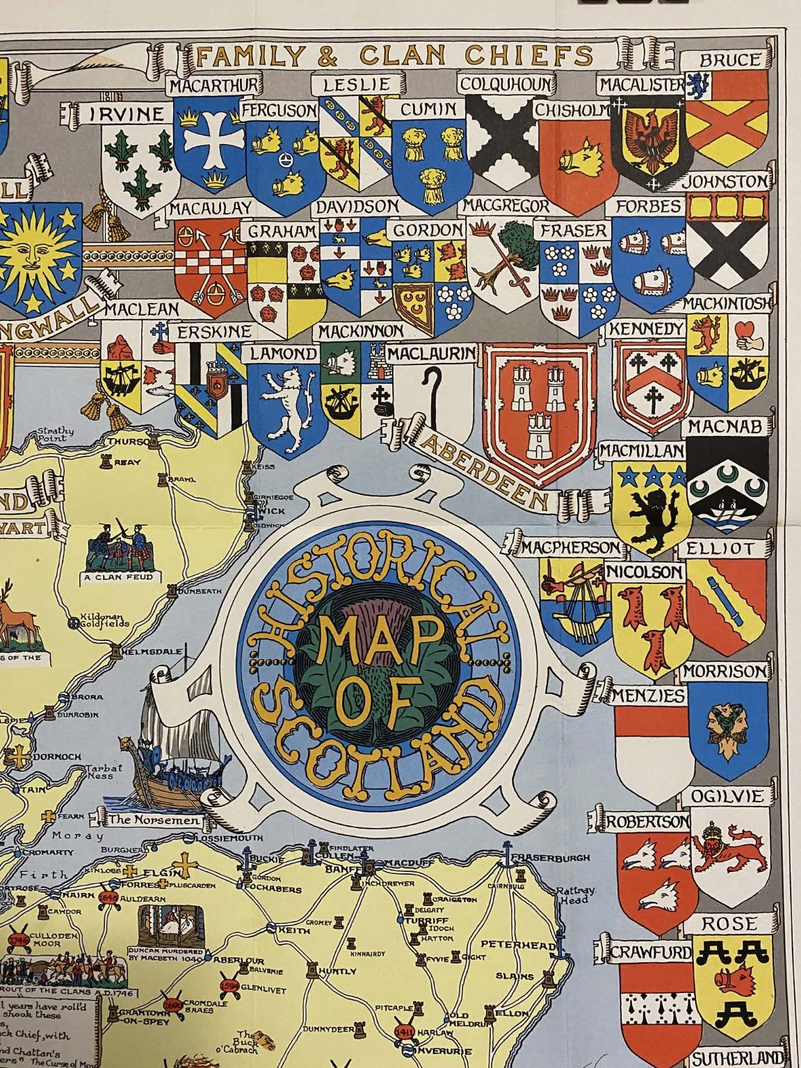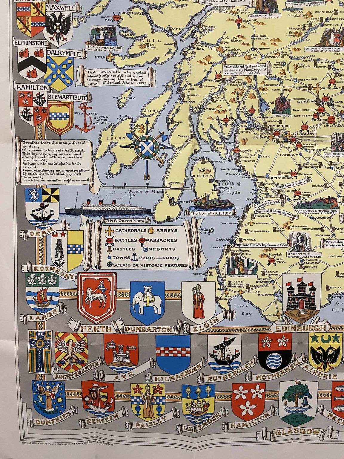 With historical locations and events illustrated pictorially in the form of charming cartoon vignettes, the map is surrounded by the armorial crests of Scotland.