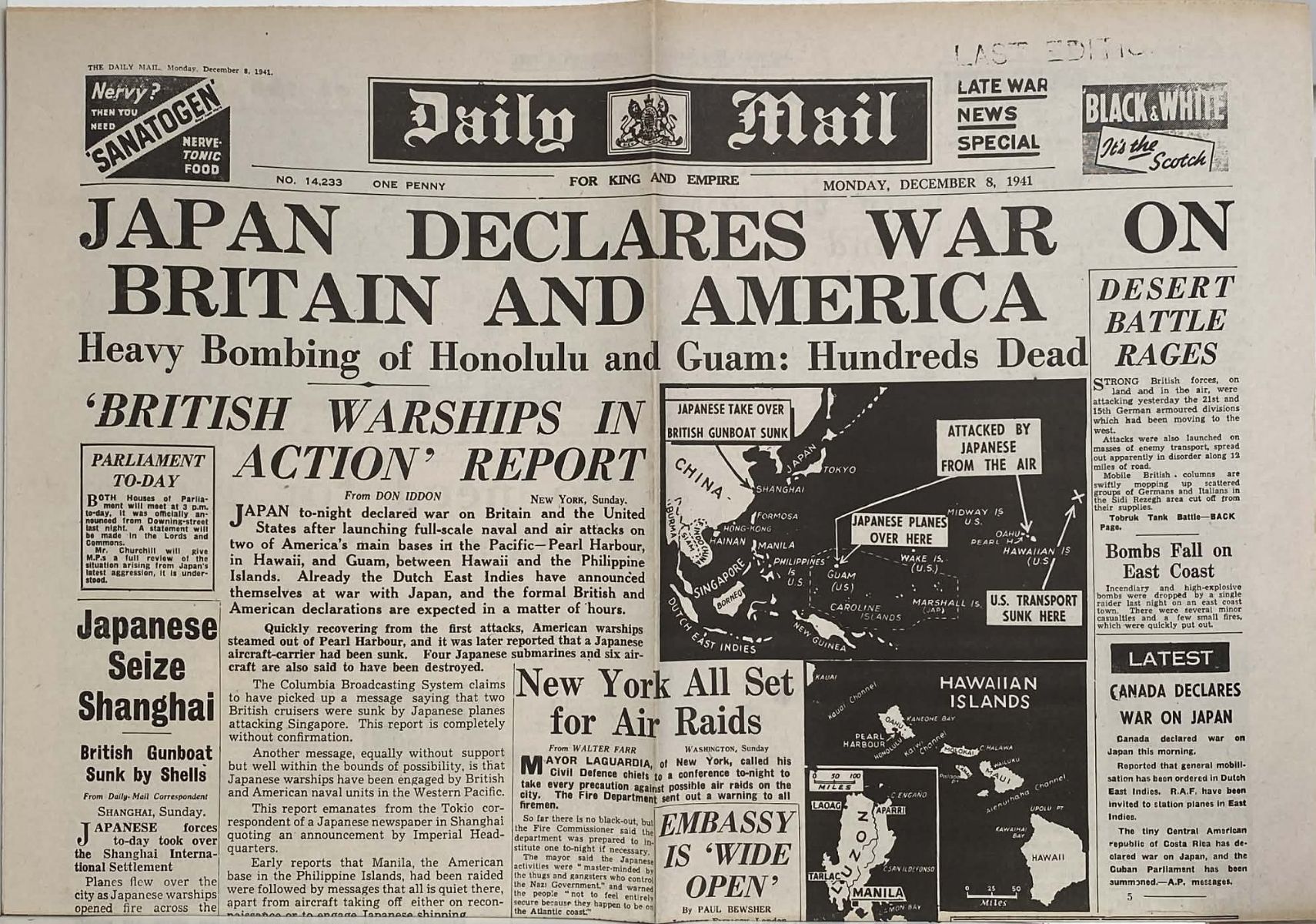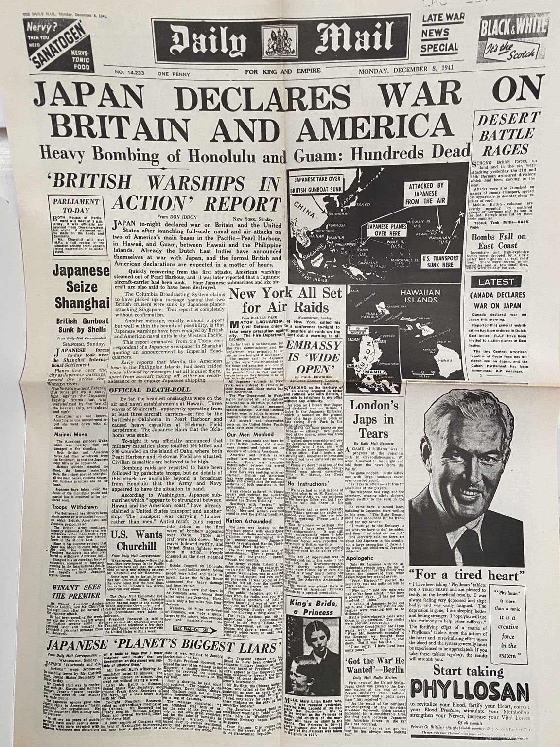 OLD WARTIME NEWSPAPER: Daily Mail - Monday, 8th December 1941