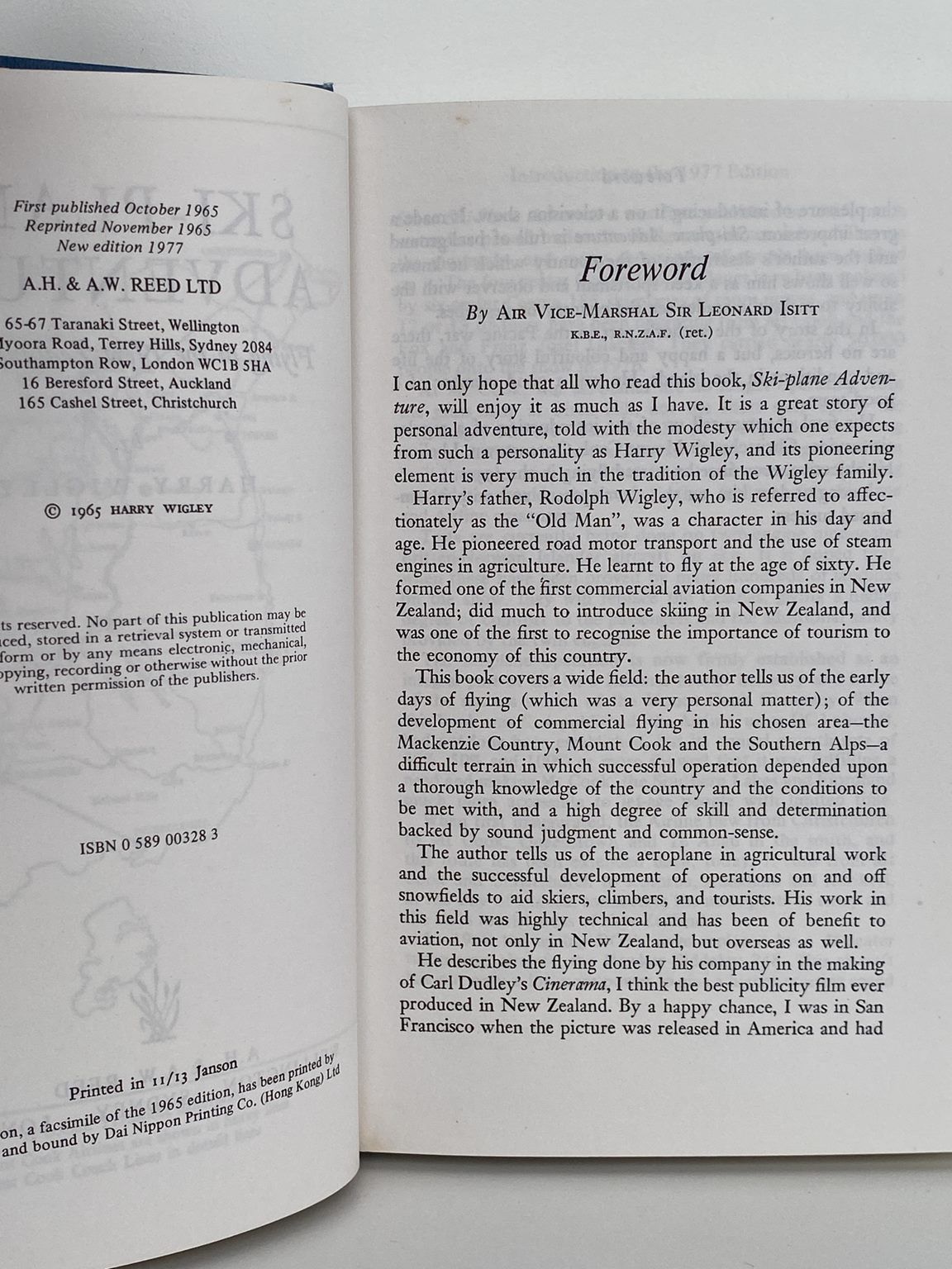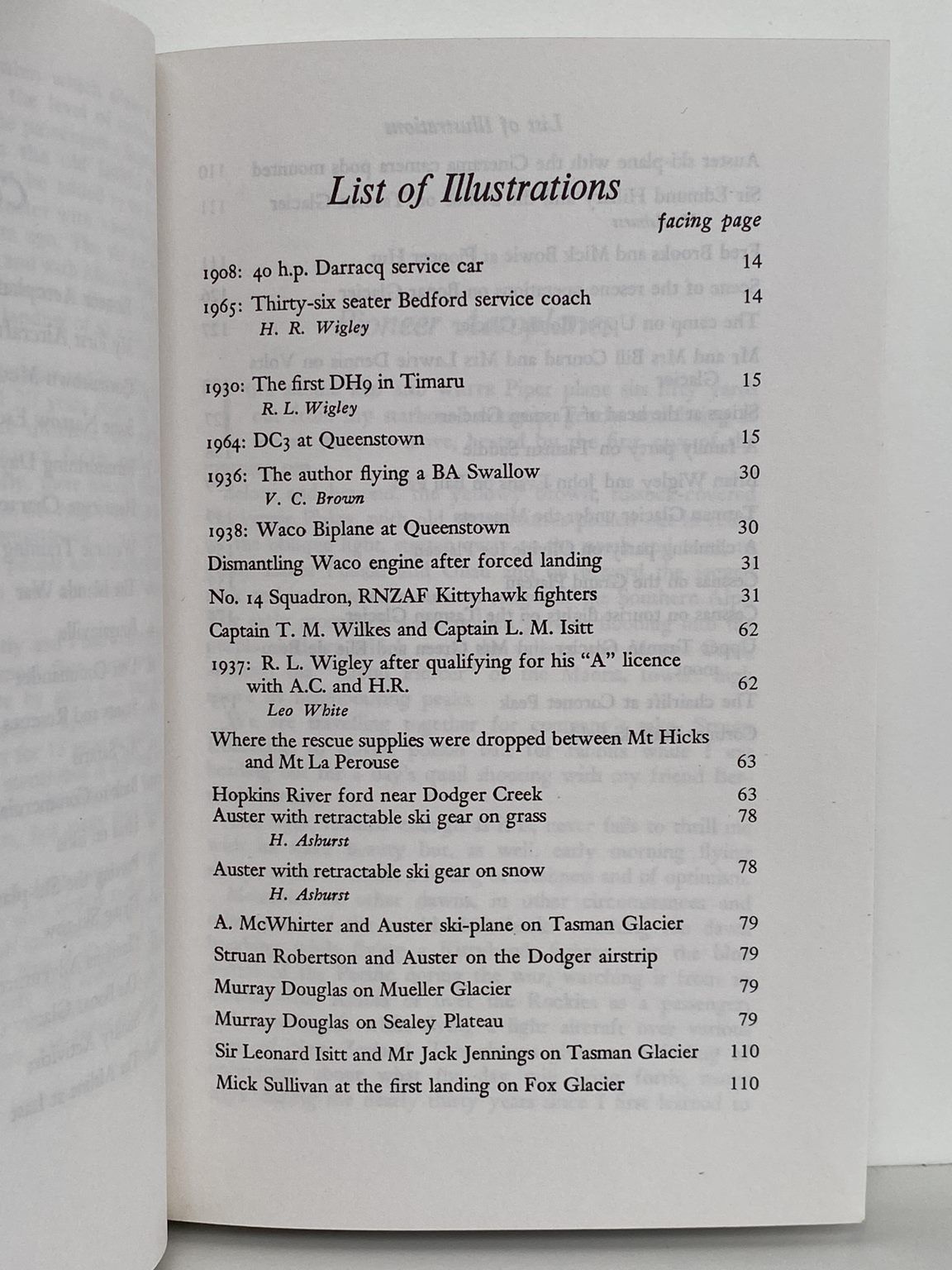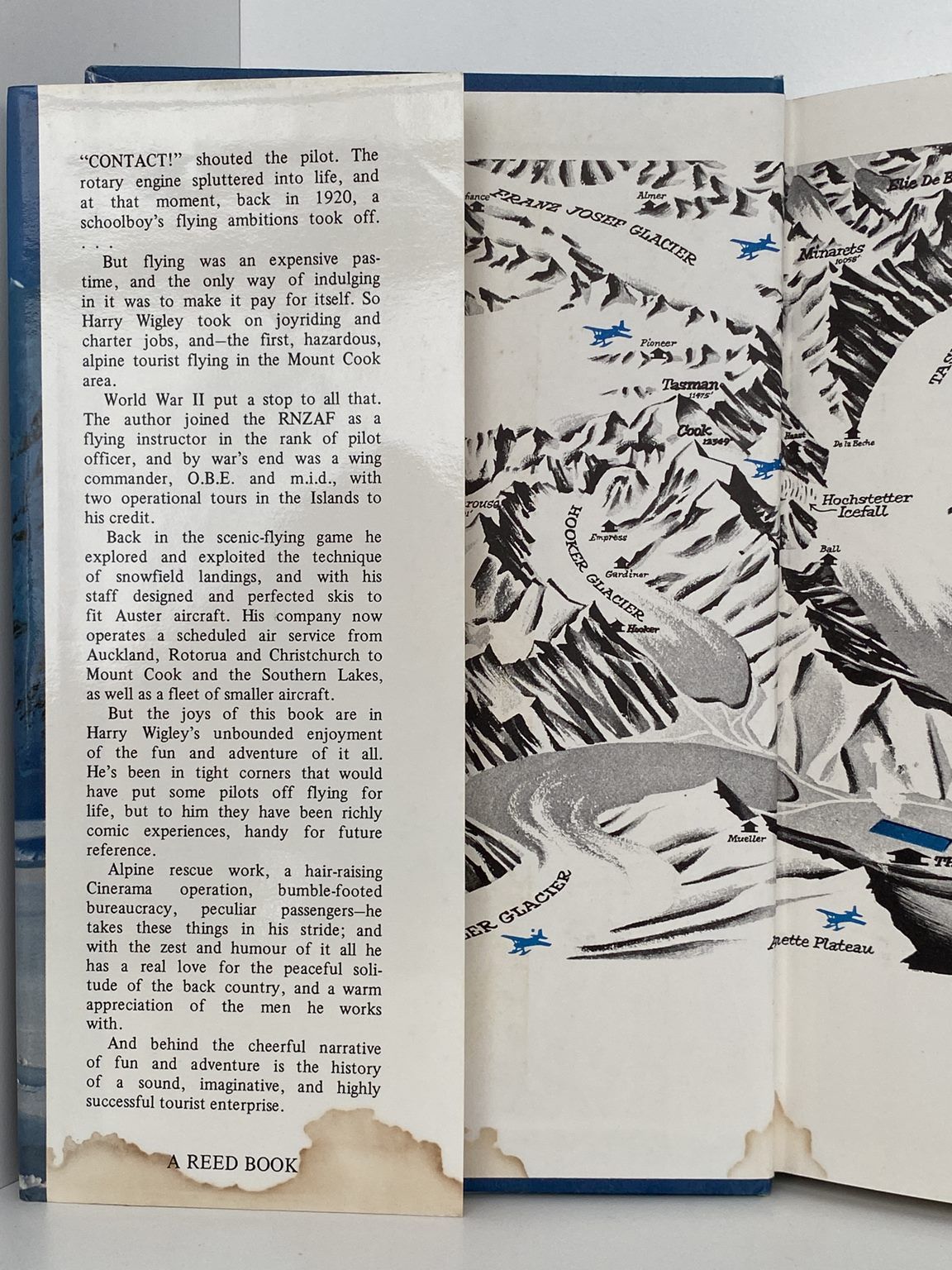 Harry Wigley was the elder son of Rudolph Wigley, who pioneered motor transport to the Hermitage, Mount Cook, designed a before-its-time tractor, and took to active flying at an age when most men were thinking of retirement. Harry Wigley greatly admired " the old man" and followed his example of vigorous and unorthodox pioneering. He was educated at Christ's College and in the cockpits of a variety of small and temperamental early aeroplanes, this is the story of his flying life.
