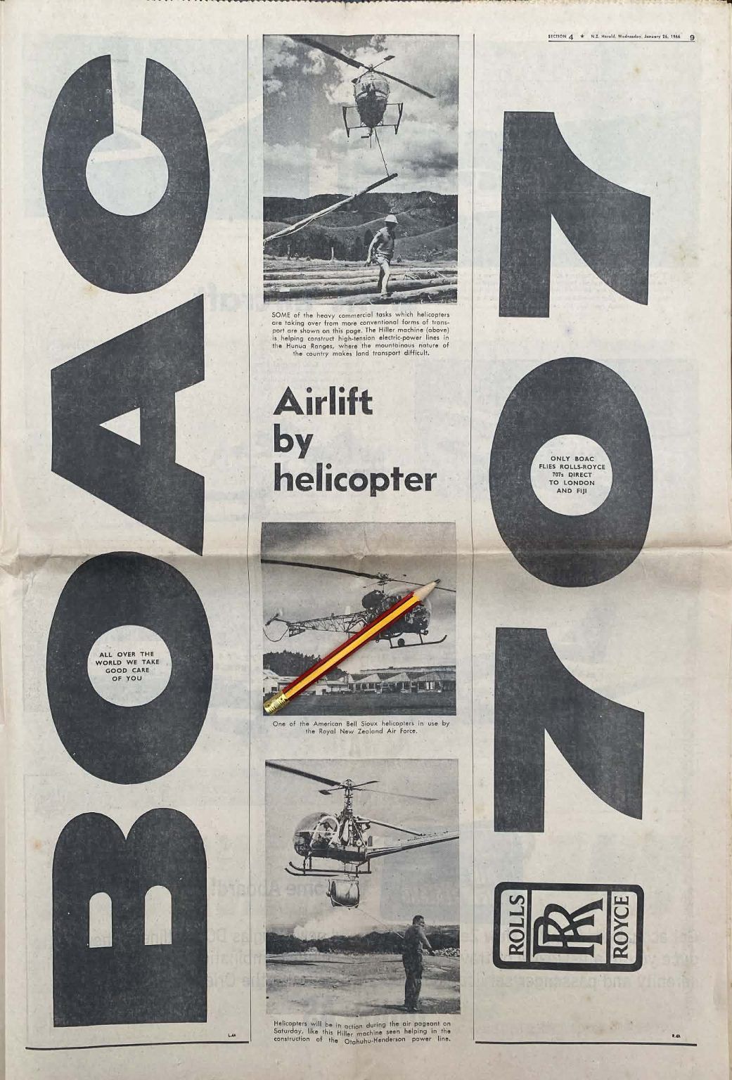 Own a unique piece of Kiwiana - an original full page vintage advert for BOAC 707 / Rolls Royce from a 1966 newspaper that would look fantastic framed.