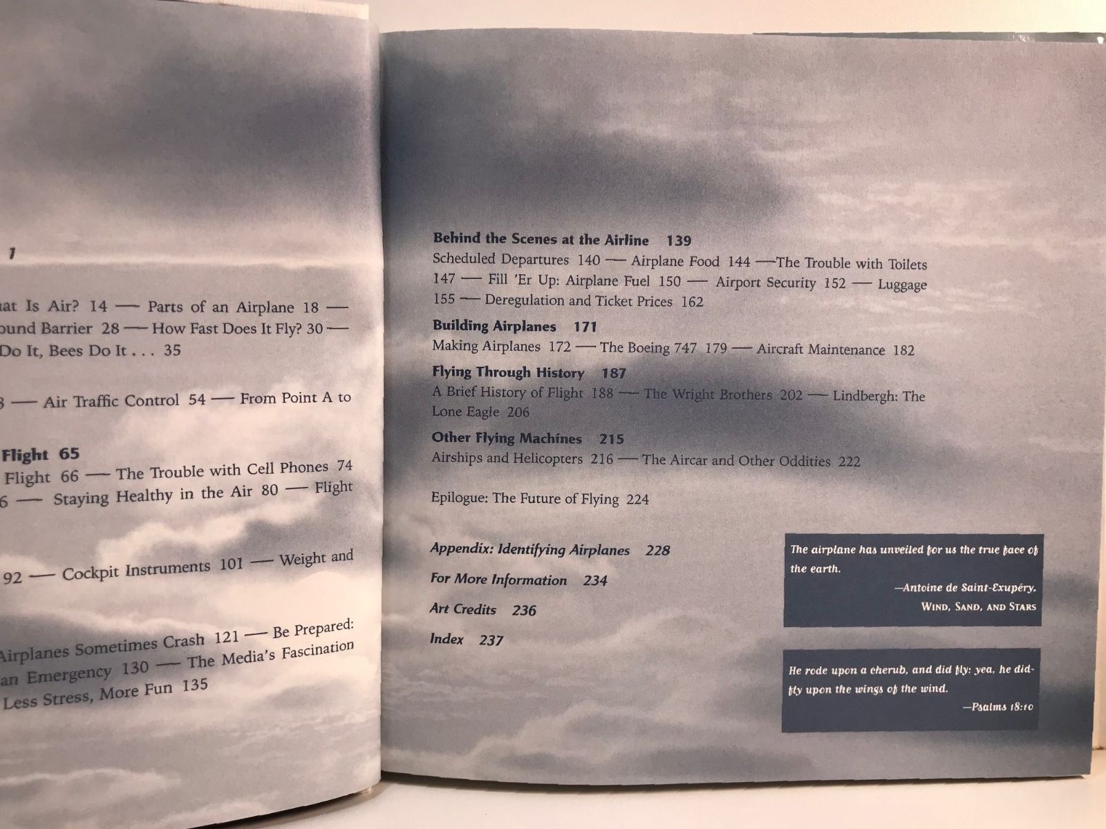 David Blatner takes readers from the cockpit to the runway, the control tower, the baggage and security systems, the airplane manufacturing plant, and beyond, explaining the many factors that make airline travel possible. There are stops along the way to examine airplane maintenance, pilot training, the effects of weather, safety statistics, tips for staying healthy, oddball aviation inventions such as the air car, and what aerodynamicists have learned from birds and bugs.