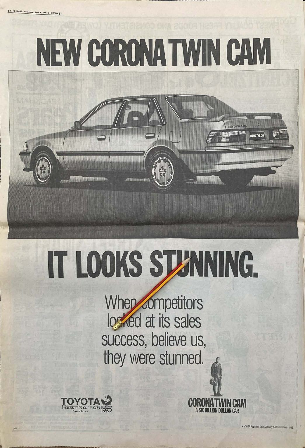 Own a unique piece of Kiwiana - an original full page advert for Toyota Corona Twin Cam from a 1990 newspaper, that would look fantastic framed.