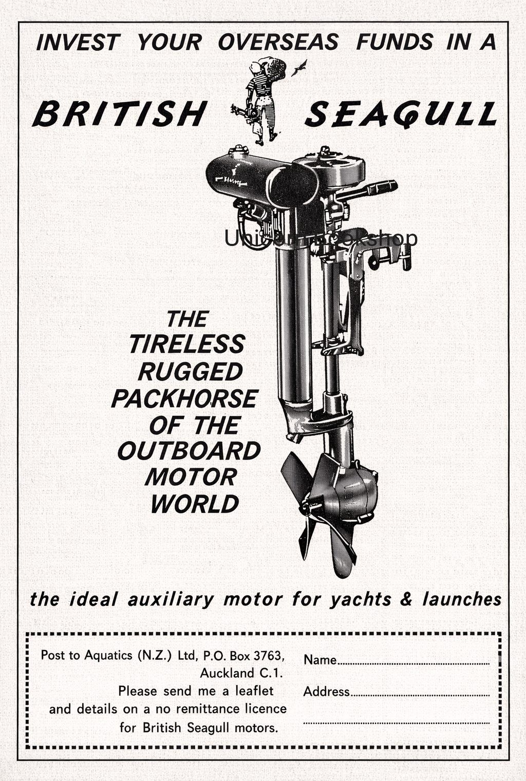 This is an near identical modern reproduction of a small vintage advert for the 1967 British Seagull Outboard Motor from 59+ years ago that would look fantastic framed.