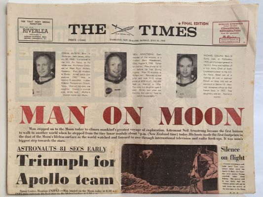 1968. Vintage newspaper covering the Moon Landing in 1968.